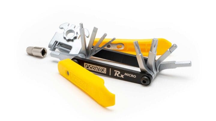 Now Pedro’s has added a 2mm hex wrench to its line of Rx Micro multi-tools, updating the Micro-6, 9, and 20 tools to the Micro-7, 10, and 21 (with each number representing the total number of tools on each one). The Micro-7 includes 2, 3, 4, 5, and 6mm hex wrenches, a T25 Torx, and a flat blade screwdriver. The 10 adds in 2.5mm and 8mm hex wrenches and a T30 Torx. And the 21 adds in a 13-speed chain tool with integrated 7mm and 8mm Flare Box Wrenches, 3.23, 3.30, and 3.45 spoke wrenches, Shimano crank cap tool, and a Presta valve core tool as well as micro tire levers. The micro tire levers are also available separately and can slot around any Rx Micro multi-tool to make a more complete, compact tool kit on the go.