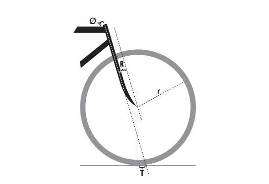 I like to think of a bicycle’s fork trail as the lever that rights the bike; one way to increase a bike’s stability is to increase the fork trail. Trail, T, is related to the above variables by this expression: