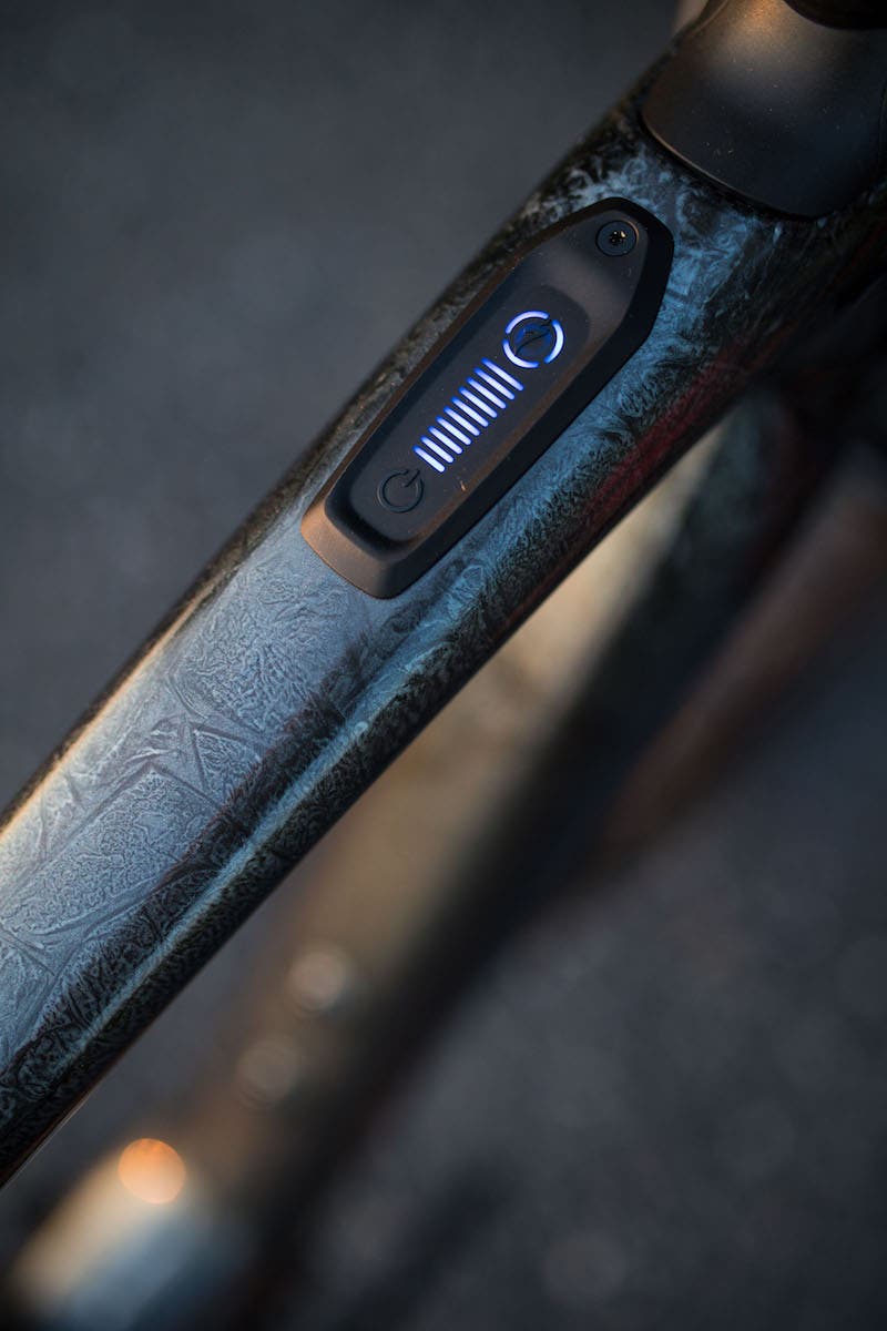 Specialized designed its SL 1.1 hub based motor in-house, giving it precise control over how the unit runs and integrates with the frame. Providing up to 240 watts, the SL 1.1 gets you up to 28mph, but it has no drag once it reaches that limit and cuts out for a smoother ride. Toggle easily between the three modes, Eco, Sport and Turbo, by pressing the Specialized-logo button on the top tube. Using the Specialized Mission Control app, you can tune how much power each mode delivers—both sustained and peak power. There’s even an internal power meter whose data can be connected to any ANT+ device.