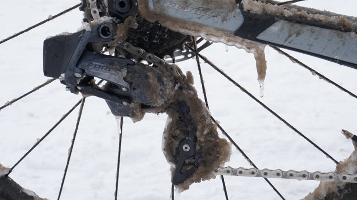 The short of it is this: SRAM’s eTap AXS wireless drivetrain works like a charm in nasty conditions. Those of you who have ridden mechanical bikes in ice and slush know that shifting can be compromised when cables get gunked up. With a wireless system, that whole situation is removed.