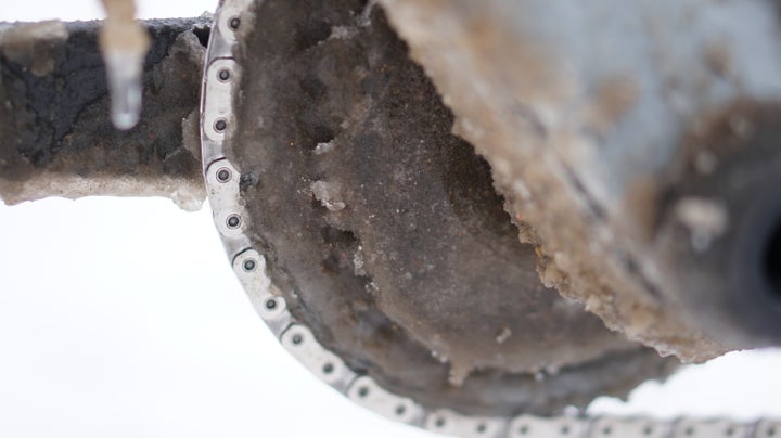 The ice build-up did cause two problems over the course of the day. One, the small chainring would become a frozen block of ice when I kept the chain on the big ring for a while, requiring me to stop and clear the ice off. This would happen on any two-ring system. And two, the Quarq power meter stopped working, not because of the sub-zero temps during the first couple of hours but seemingly because of ice build-up in the final hours. After the ice thawed, functionality resumed.