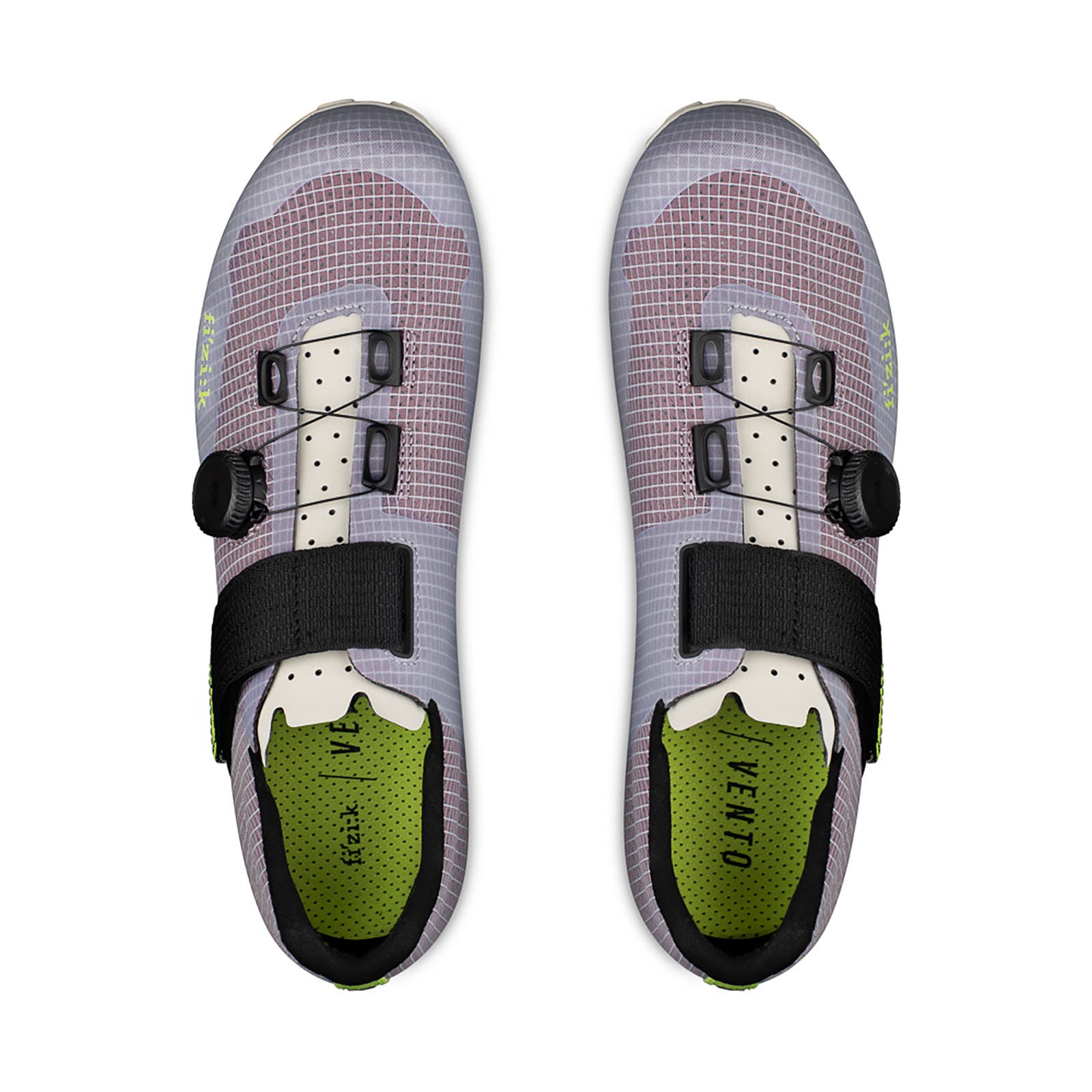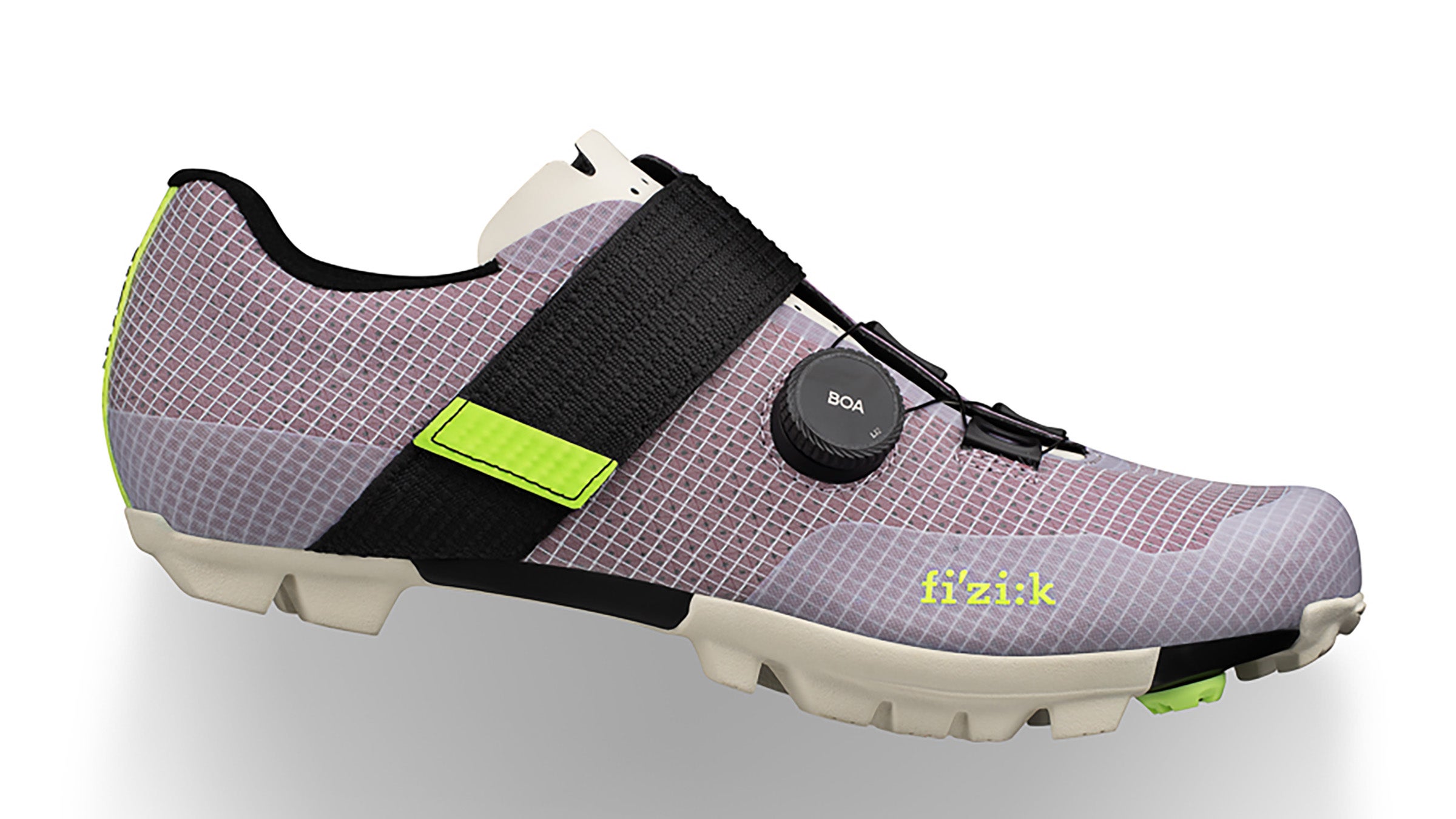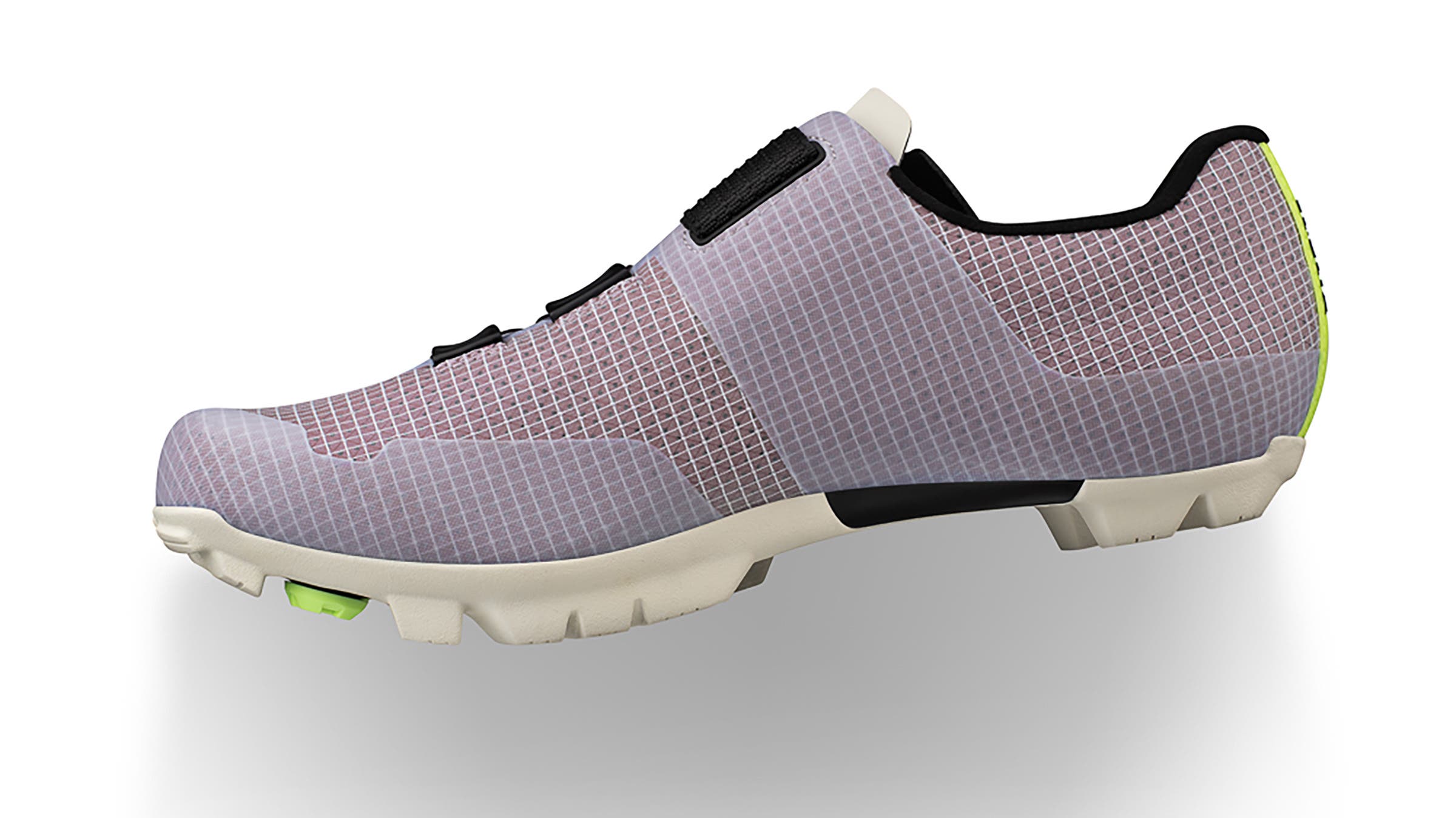 The shoe also comes in black, but the most striking ‘lilac’ color highlights the laminated-mesh construction of the upper, which Fizik claims to be breathable and supple but durable against cuts.