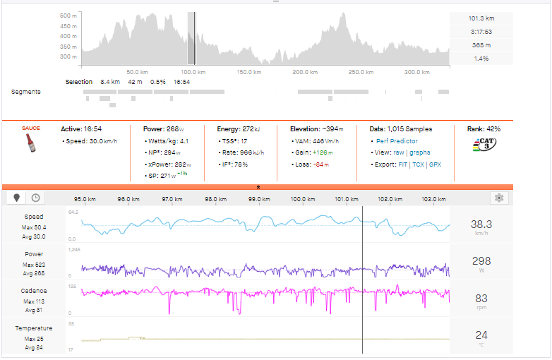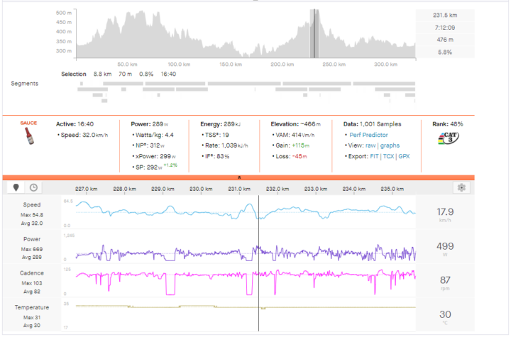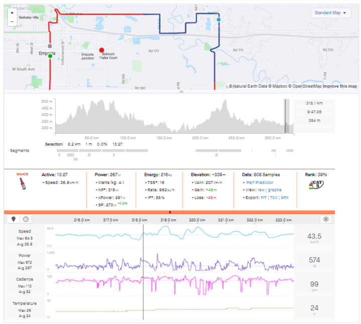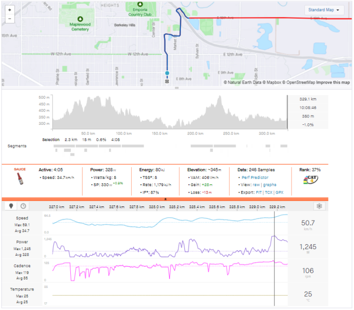 The easiest hour by Normalized Power was still ridden at nearly 4 w/kg, and the final 10 km were the highest-powered kilometers of the entire 200-mile race.