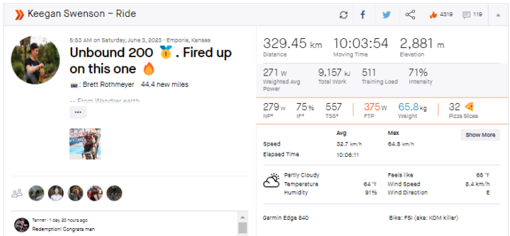 At over 1,000 w and 59 kph, Swenson would’ve torched most amateur riders in a town sign sprint on a coffee ride. But after 10 hours of racing, having burned 9,000 calories and conquered over 200 miles of Flint Hills gravel, Swenson’s sprint power is out of this world.