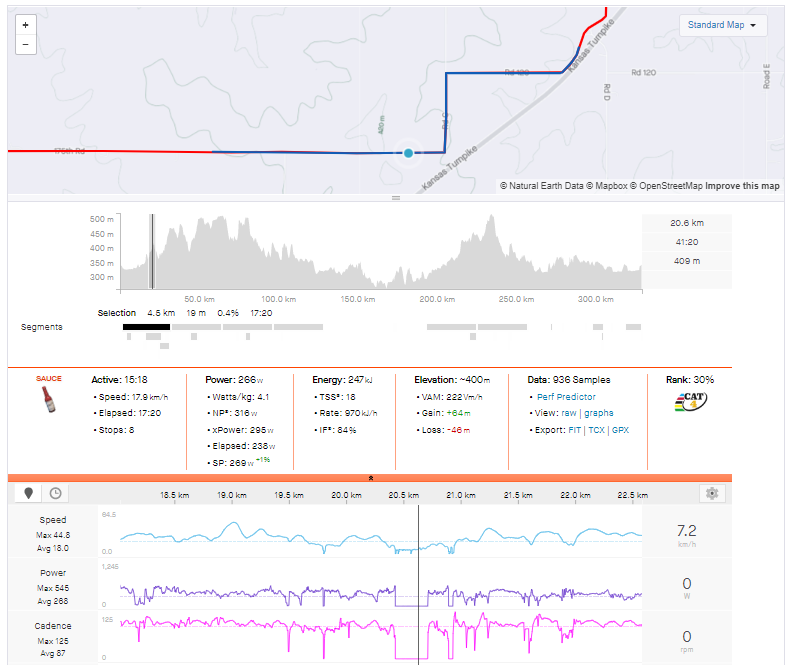 The craziest part of the rest of this power analysis is that Swenson did all these numbers eight, nine, and 10 hours into the race. Most cyclists have never spent that many hours on the bike in a single day, even if you count the ‘chamois time’ spent sitting at a coffee shop or gas station. That said, let’s take a look at a turning point in the race where there was a series of steep climbs with 100 km to go.