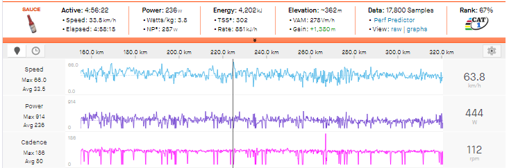 Hour 3: Average Power: 287w (4.4w/kg) Normalized Power: 331w