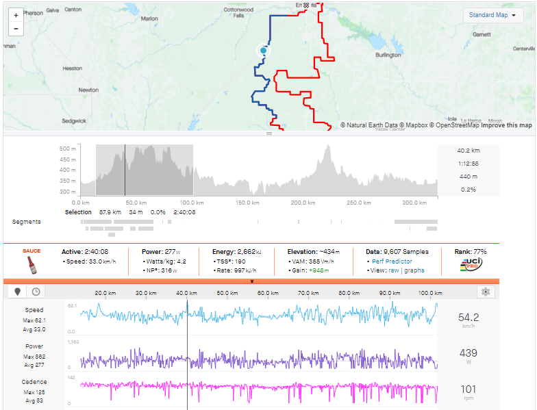 I’ve included a full breakdown of Keegan Swenson’s Unbound Gravel, hour-by-hour, at the end of this article. This middle section was the hardest of the race, with Swenson routinely pushing 400-500w on the uphills, and holding 250-350w on the flats. Hour 5 and Hour 7 were the hardest, with Swenson’s normalized power being well over 300w.