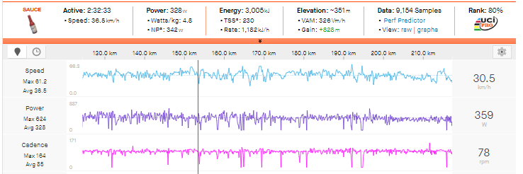 Hour 8: Average Power: 268w (4.1w/kg) Normalized Power: 288w