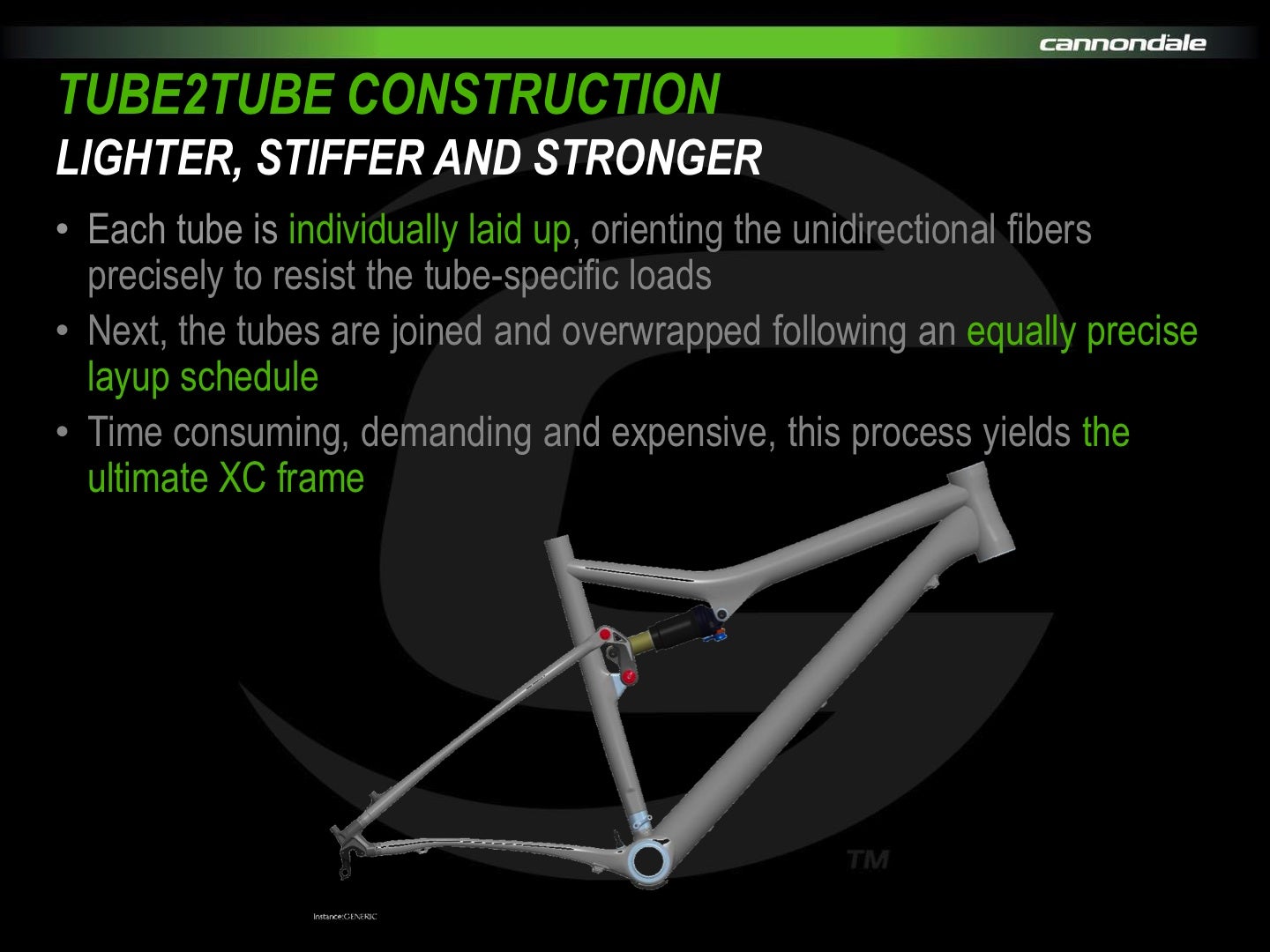 The new Scalpel has no rider weight limit, even though all of the chainstays and seatstays are the same on bikes of all sizes. However, the layup of the front triangle is size-specific, and Cannondale claims to have tested this bike just as hard in its state-of-the-art test facility as its long-travel bikes. Company tests, as well as those by an independent test lab, are claimed to have demonstrated that this frame has by far the highest stiffness-to-weight ratio of any full-suspension frame. Cannondale further claims that it is lighter than any other full-suspension frame, and when compared without the shock is more than 600 grams lighter than its lightest competitor.