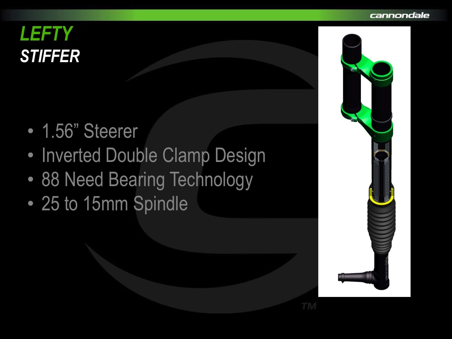 The straight head tube with pressed-in 1.5-inch headset bearings that Cannondale pioneered with the Headshok has become an industry standard, and it affords the rigidity that the Lefty depends on.