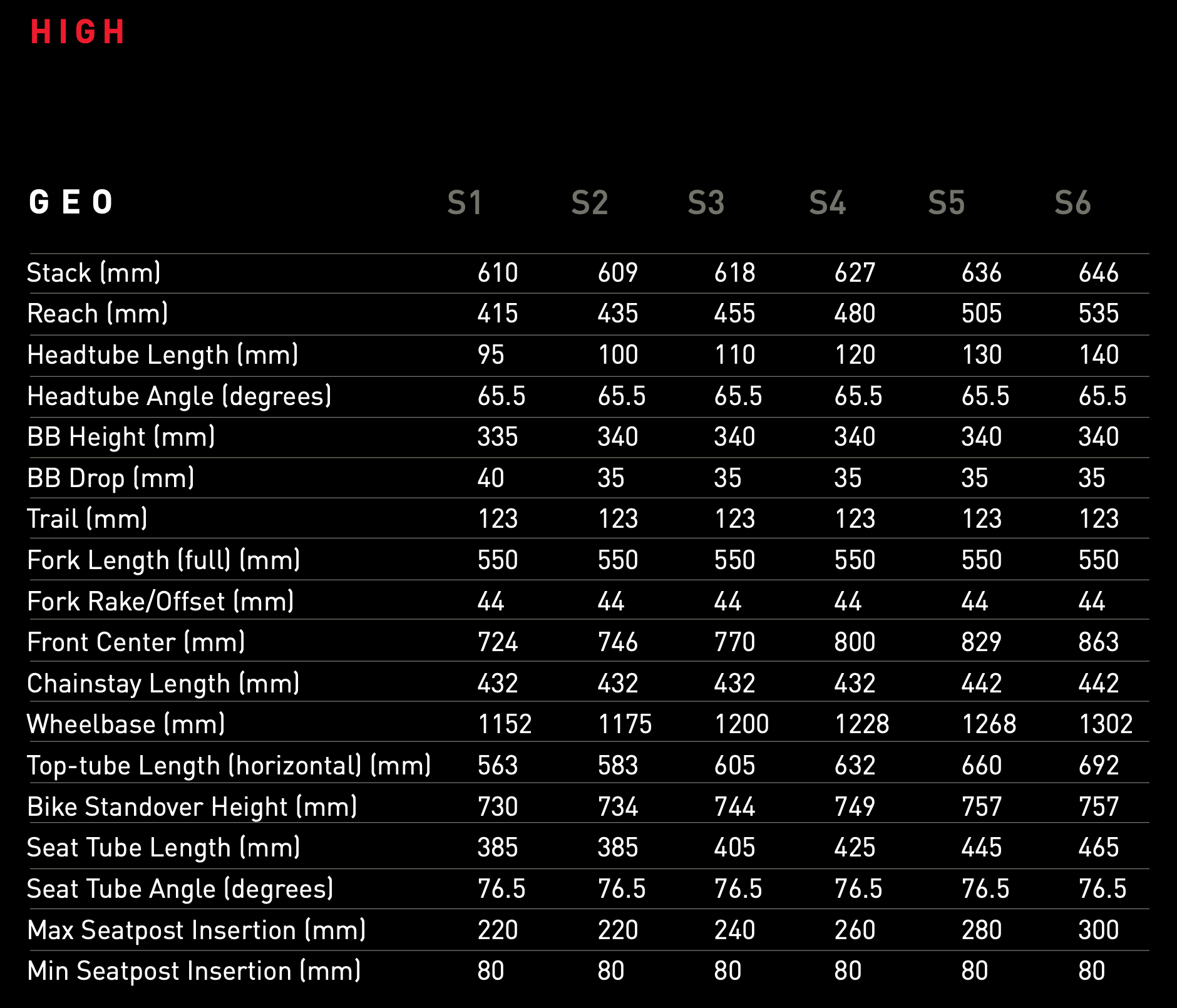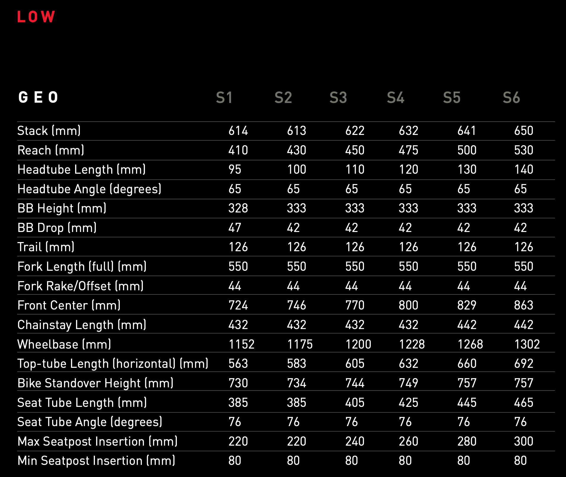 Specialized’s “S-Sizing” for the Stumpy Evo allows you to choose frame size based on terrain and riding style, and not just straight-up measurements. Specialized says that determining size is easy as each of the sizes from S1 to S6 correlates to a previous size. What this means is if you previously rode a medium, then S-3 will be your equivalent size. But, if you want a quicker, more nimble ride, you’d drop down by a size, so in this case to an S2; if you’re wanting for more stability go up a size, so for this example, to an S4.