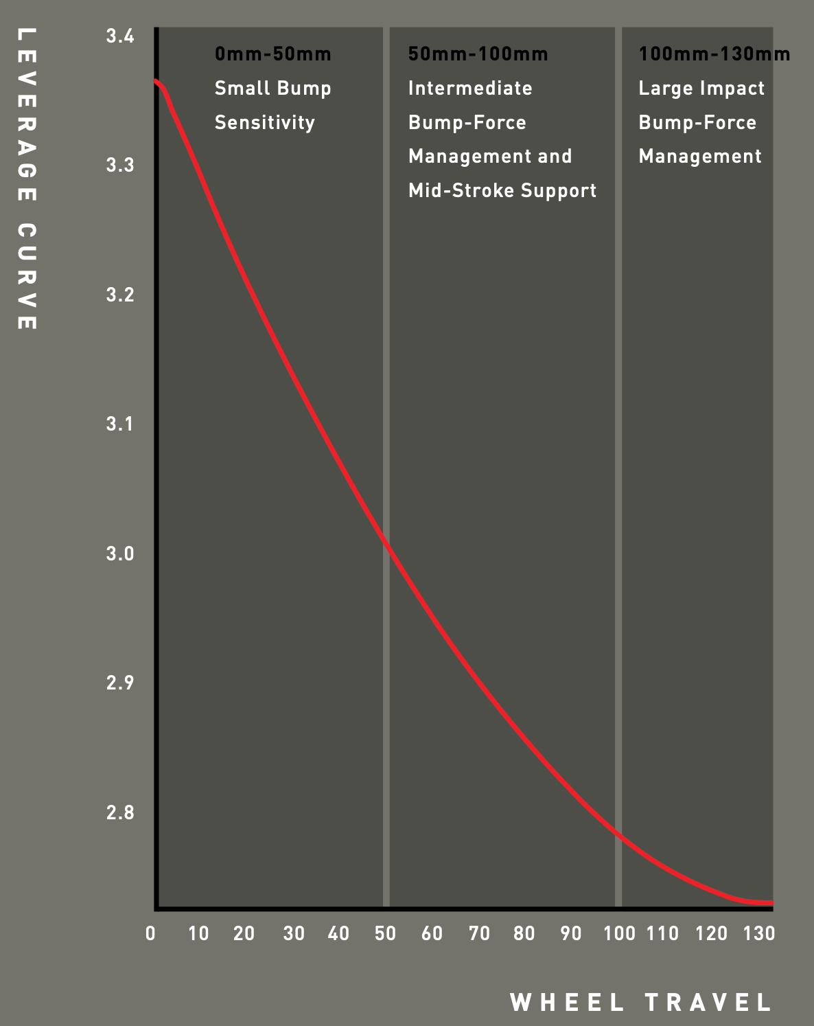 The Stumpjumper’s progressive leverage offers a steep slope — in other words, a good platform to pedal against through the mid-stroke, and improved bottoming resistance at the end of the stroke. Specialized says the result of this profile is, “a snappy ride for the first two-thirds of travel, then — thanks to an increased spring rate — excellent bump force management and resistance to bottoming.”