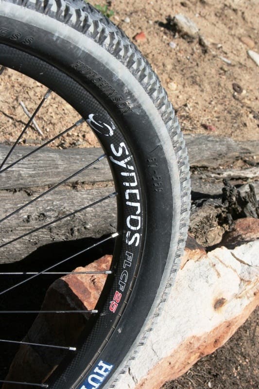 Syncros measures the rim width at 25mm. It’s an important dimension because wide rims (and a correspondingly wide gap between tire bead hooks) help the tire become more stable on the rim. The sidewalls are straighter and less prone to rolling in the face of cornering side load. Plus, overall tire volume and tread contact patch go up. Even better, a wide rim accommodates wide tires all the more effectively, and as everyone knows, nice wide tires offer killer grip, bump absorption and rock ding resistance.