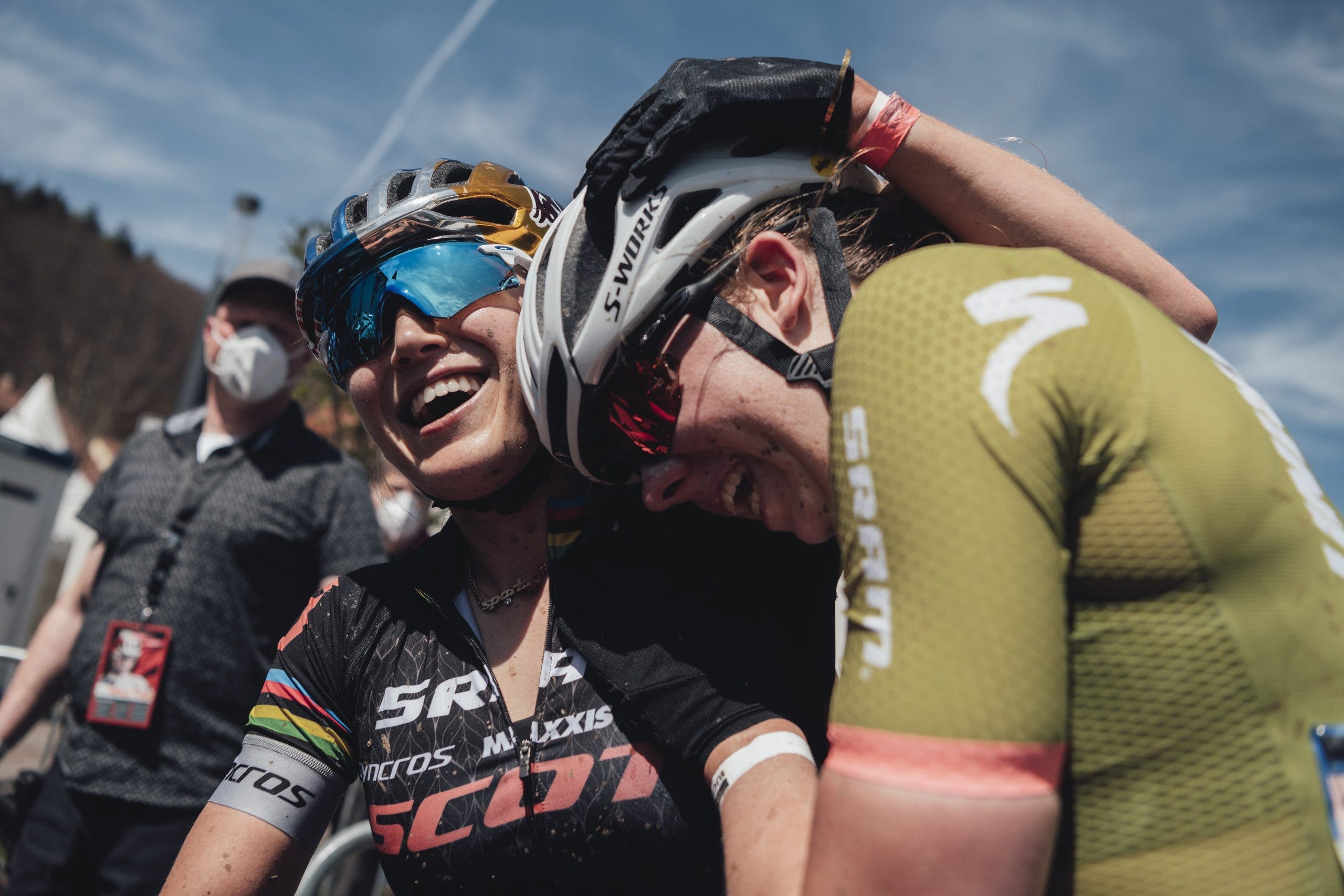 Kate Courtney and Haley Batten celebrate Batten’s third-place finish in Albstadt, Germany. Photo: Bartek Wolinski