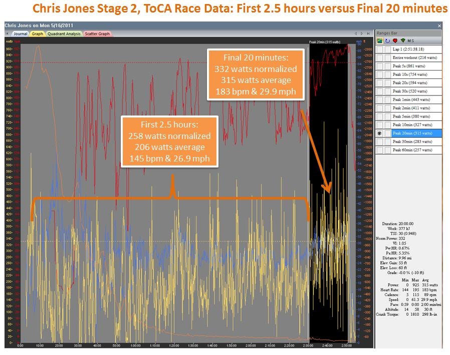 For the final 20 minutes of the race, Jones’ normalized power was 332 watts and his average power was 315 watts with an average heart rate of 183bpm.