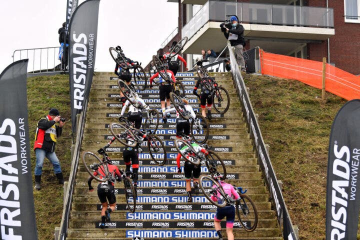 The grassy Dutch track hosted the World Cup-level “GP Adrie van der Poel” through recent years on a circuit characterized by the “stairway to heaven” stack of steps and a now-iconic 180-degree bend around a tree.