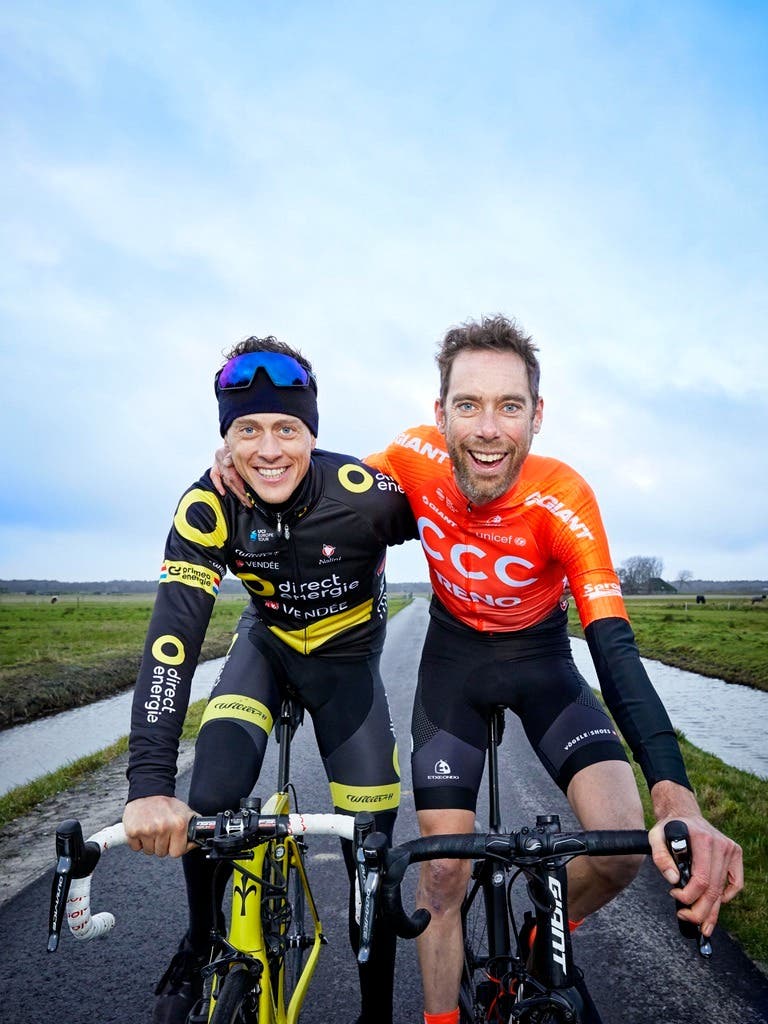 Dutch's Niki Terpstra of Total Direct Energie (R) poses with a supporter before the start of the one day cycling race 'Marcel Kint Classic' (199km), stage 7 of 11 of the Exterioo Cycling Cup, from Kortrijk to Zwevegem, in Zwevegem on May 29 2022. - Belgium OUT (Photo by DAVID STOCKMAN / BELGA / AFP) / Belgium OUT (Photo by DAVID STOCKMAN/BELGA/AFP via Getty Images)