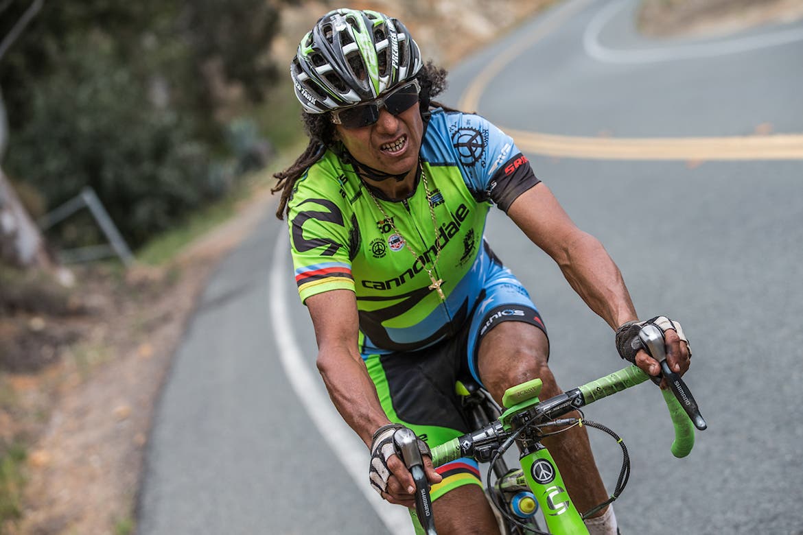 During that fast roll-out on the road, I found myself behind a small man with enormous dreadlocks. It was Tinker Juarez! The mountain biking legend had no trouble with the trails and tough climbs, but he was getting some scary speed-wobble when the pack was spun out at 50mph. Be careful, Tinker!