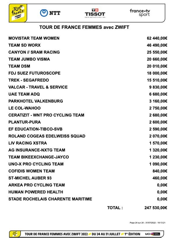 Astana Qazaqstan, which was the last place team in the men’s Tour, received €15,000 despite not winning a stage. In the Tour de France de Femmes, that was about the same amount of money earned by Trek-Segafredo, which was the seventh-ranked team by earnings.