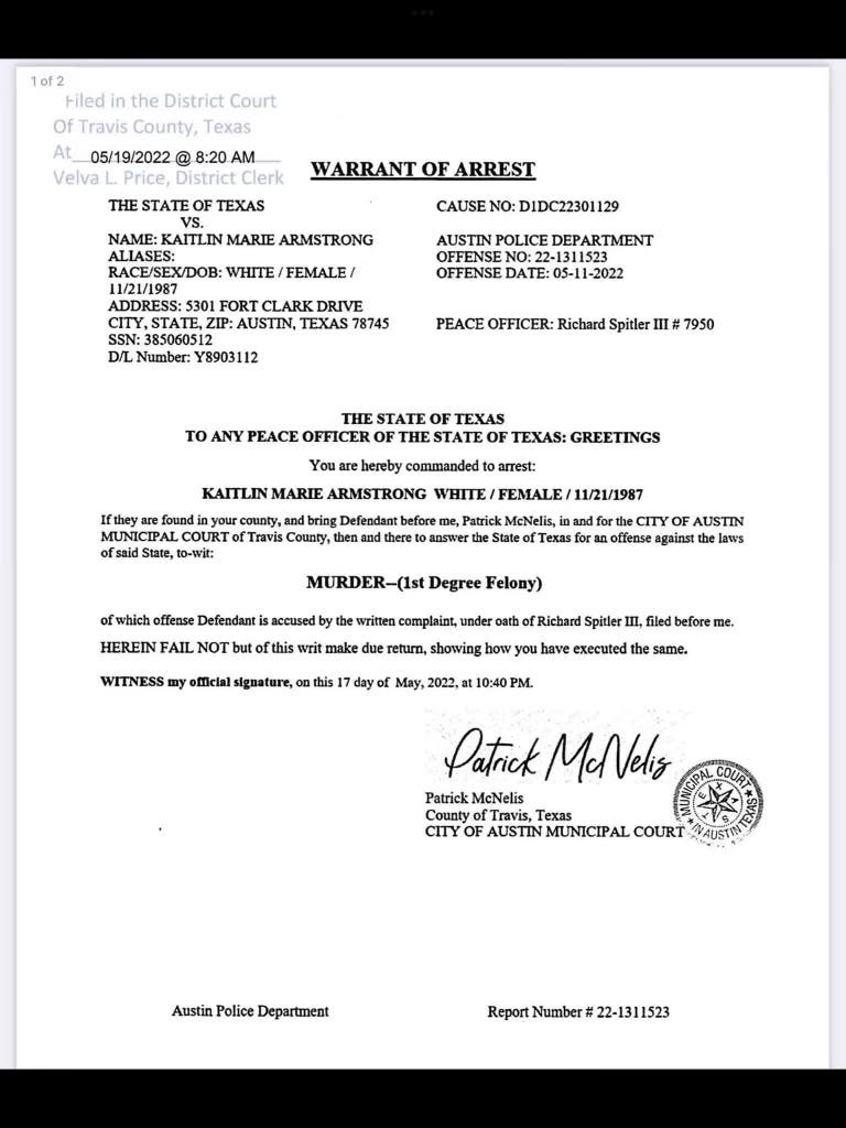 The warrant named Kaitlin Marie Armstrong, 34, in the warrant for first-degree murder felony charges. Wilson, 25, was found shot dead in an Austin apartment on May 11.