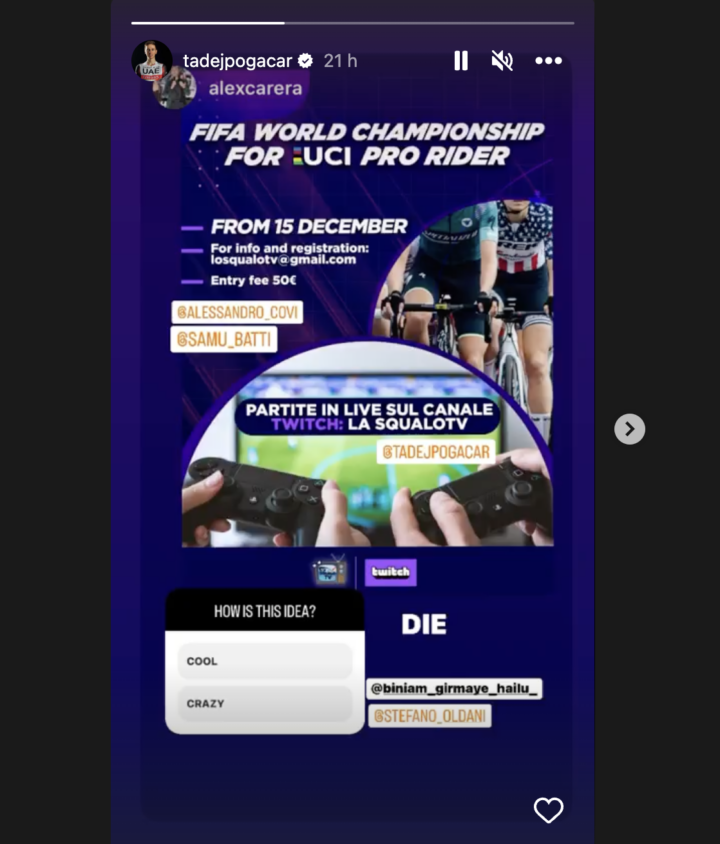 Tadej Pogačar, Vincenzo Nibali and possibly Jonas Vingegaard could be about to lock horns in their biggest encounter yet — a FIFA-based rider tournament organized during the off-season that is set to be streamed on Twitch.