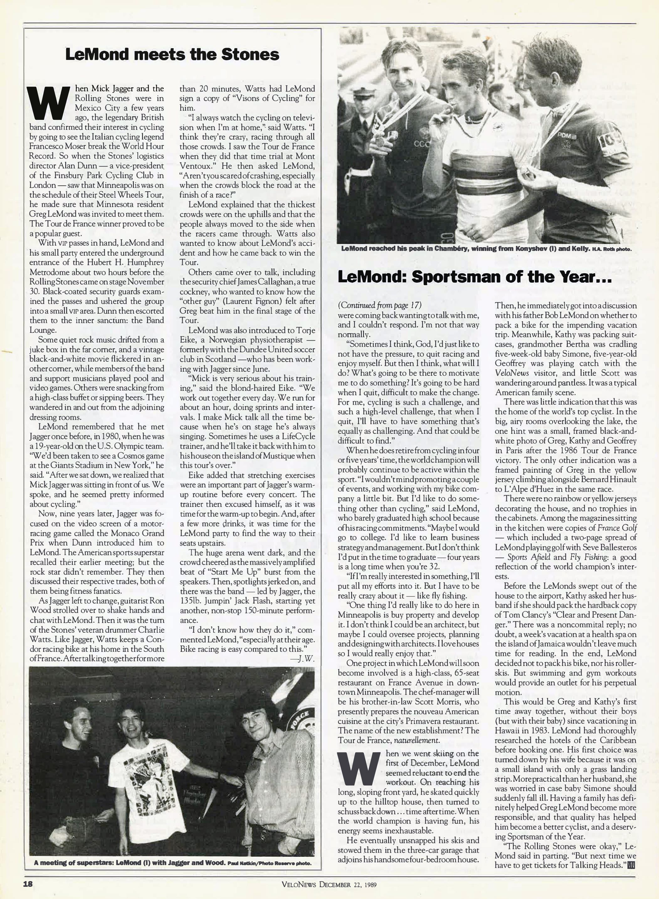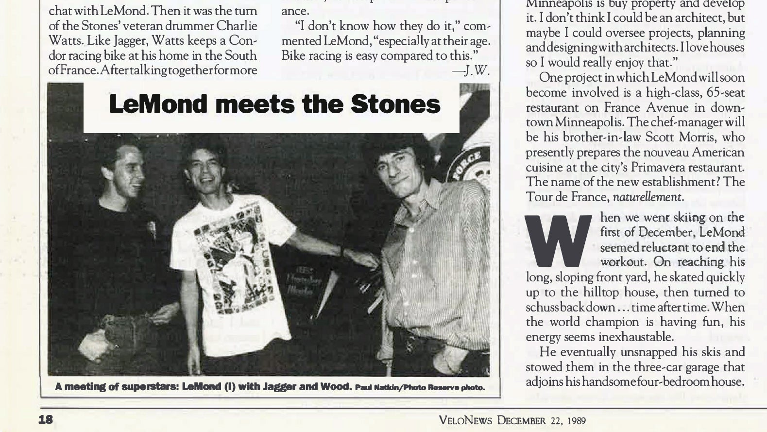 When Mick Jagger and the Rolling Stones were in Mexico City a few years ago, the legendary British band confirmed their interest in cycling by going to see the Italian cycling legend Francesco Moser break the World Hour Record. So when the Stones’ logistics director Alan Dunn — a vice-president of the Finsbury Park Cycling Club in London — saw that Minneapolis was on the schedule of their Steel Wheels Tour, he made sure that Minnesota resident Greg LeMond was invited to meet them. The Tour de France winner proved to be a popular guest.