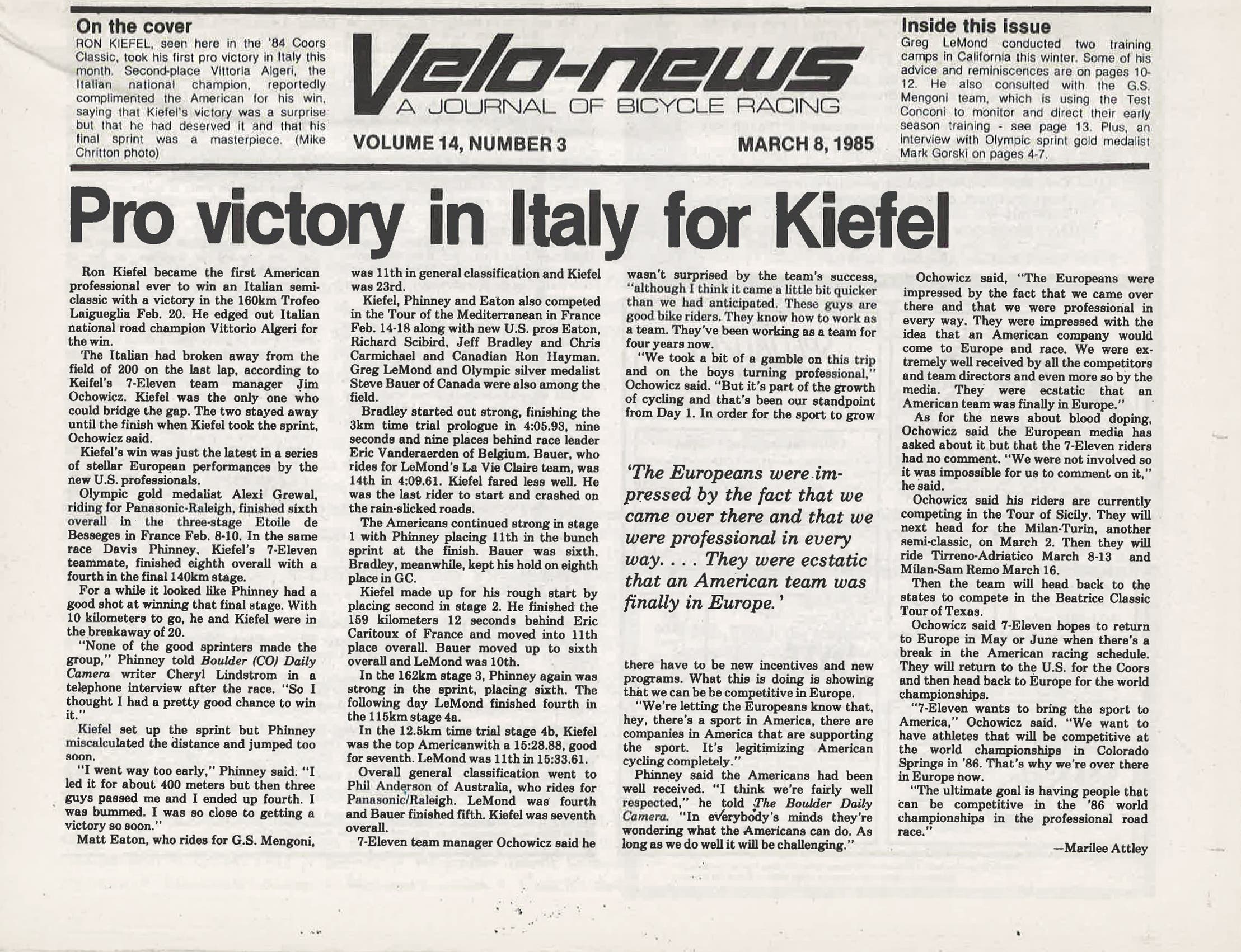 Here is an excerpt from the story by Marilee Attley from the March 8, 1985 edition of VeloNews, then known as Velo-news: