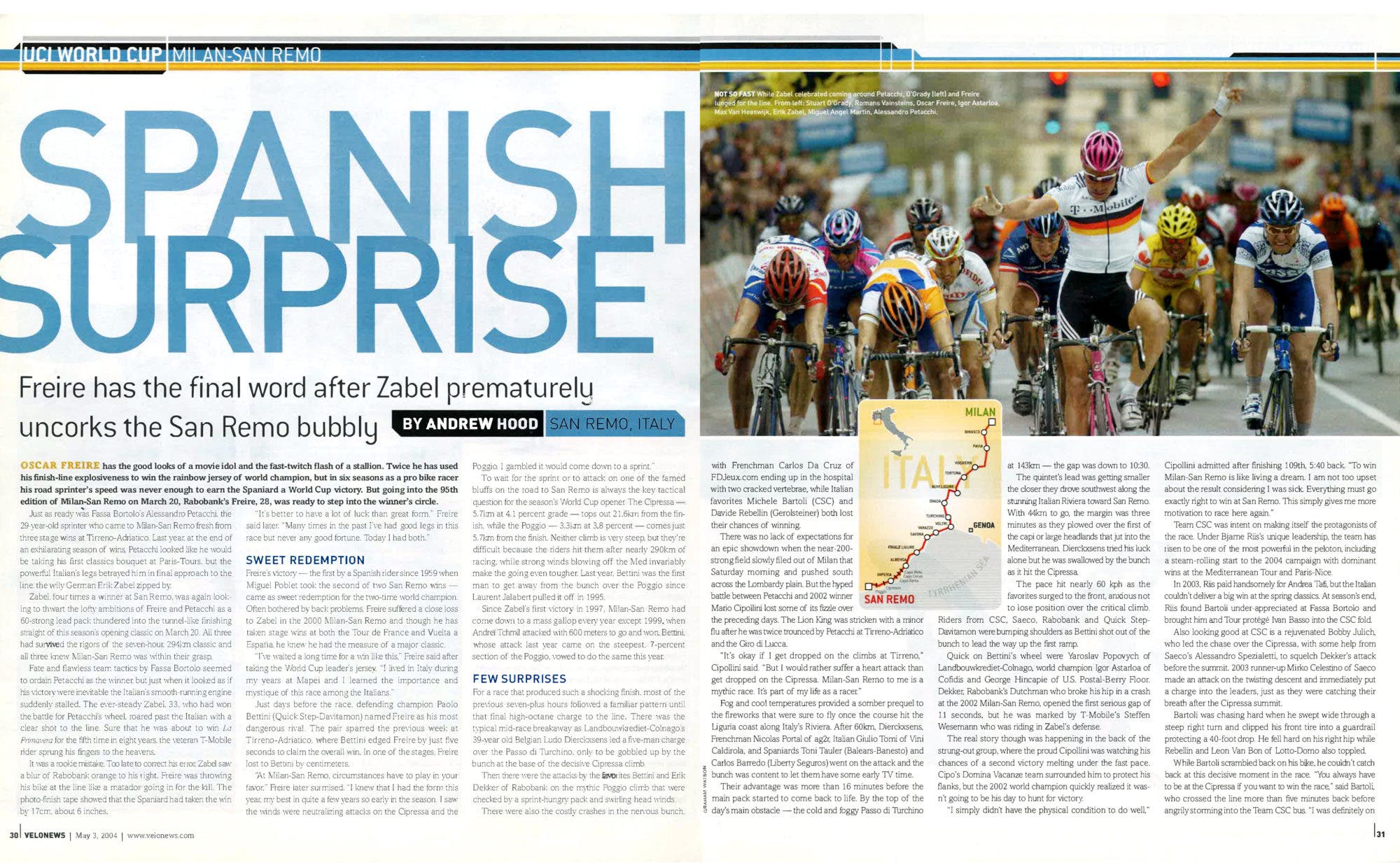 Here is an excerpt from Andrew Hood’s story about Zabel’s blunder in the May 3, 2004 issue of VeloNews. The German sprinter would never win the spring’s first monument classic after that missed opportunity in 2004.