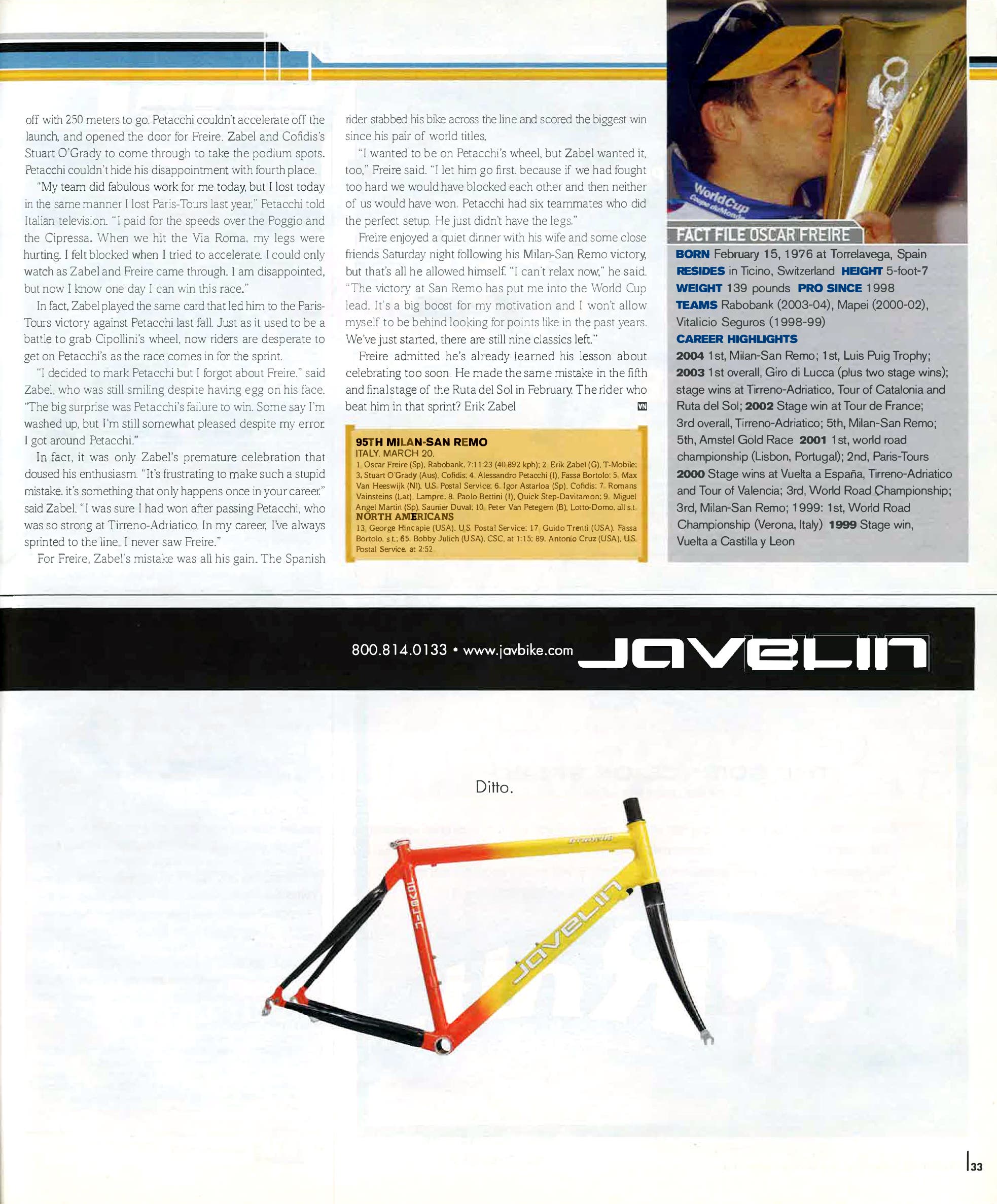 Oscar Frèire has the good looks of a movie idol and the fast-twitch flash of a stallion. Twice he has used his finish-line explosiveness to win the rainbow jersey of world champion, but in six seasons as a pro bike racer his road sprinter’s speed was never enough to earn the Spaniard a World Cup victory. But going into the 95th edition of Milan-San Remo on March 20, Rabobank’s Freire, 28, was ready to step into the winner’s circle.