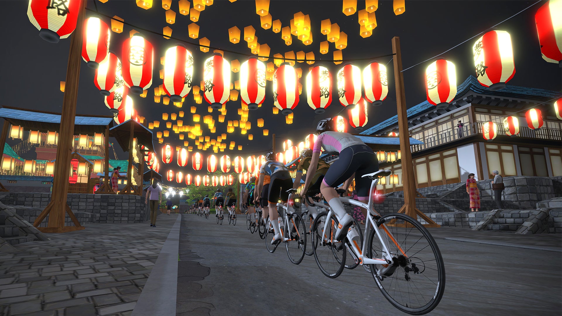 Zwift game designers packed in details like ginkgo forests with mystical creatures, cherry blossom trees, waterfalls, and temples.