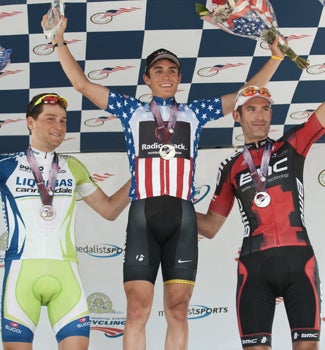 GREENVILLE, South Carolina (VN) — RadioShack’s breakout young star Matthew Busche outsprinted three-time national champion George Hincapie (BMC Racing) on Sunday to win his first professional title. Ted King (Liquigas-Cannondale) held on for third from a late selection under brutally hot temperatures.