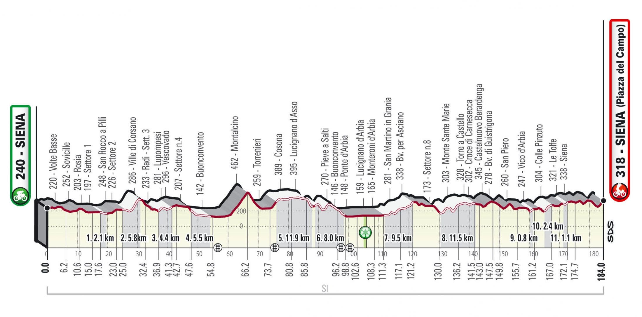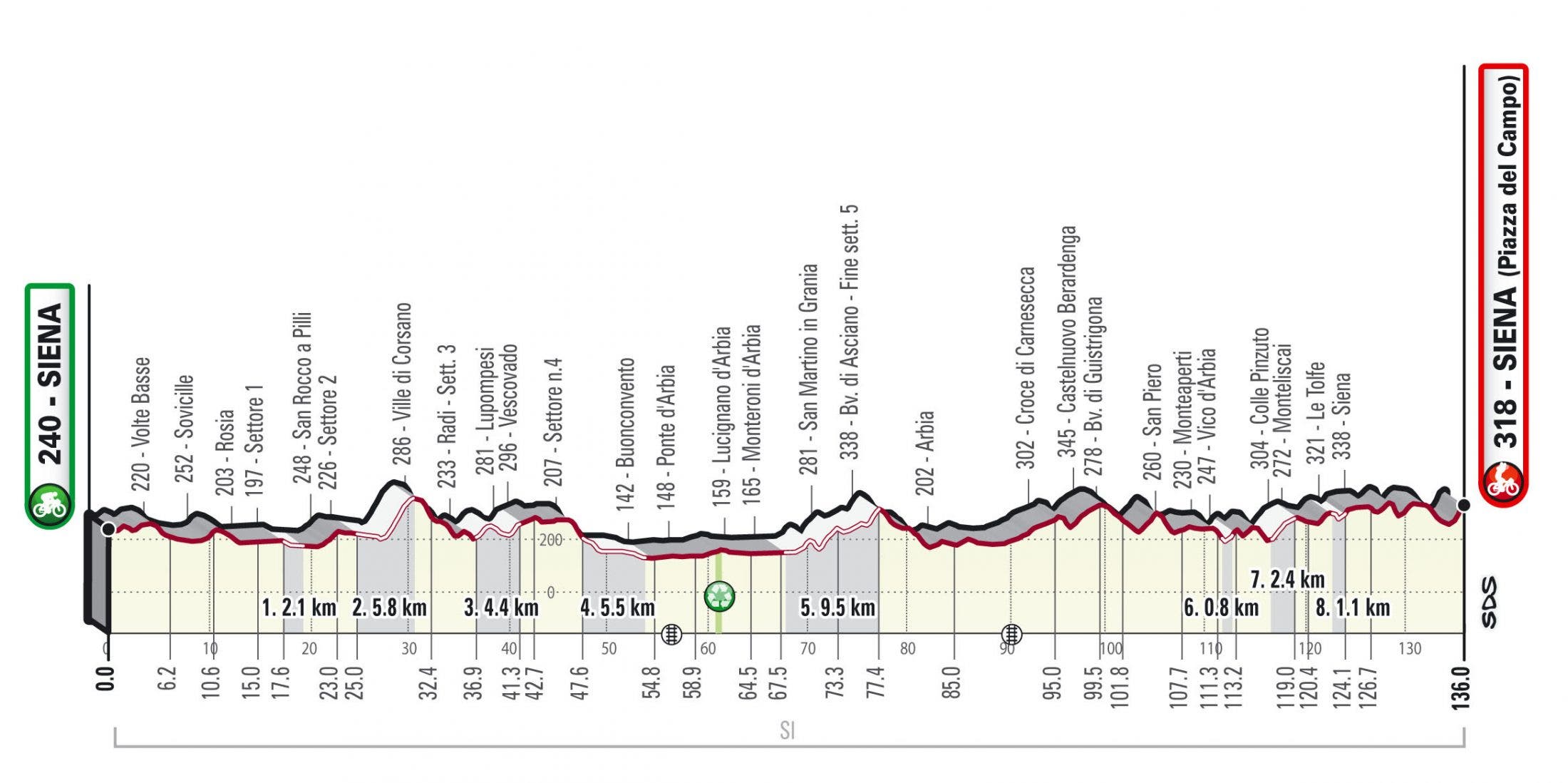 Some 23 teams lineup in Sienna for the 136km stage that features 31.4km of gravel sectors. The race starts early at 09:10 (CET), and largely traces the same route featured in the past two editions. A series of climbs and eight gravel sections will dictate the race dynamics. The traditional steep run into the historic Piazza del Campo makes for one of cycling’s most spectacular finishing arenas.