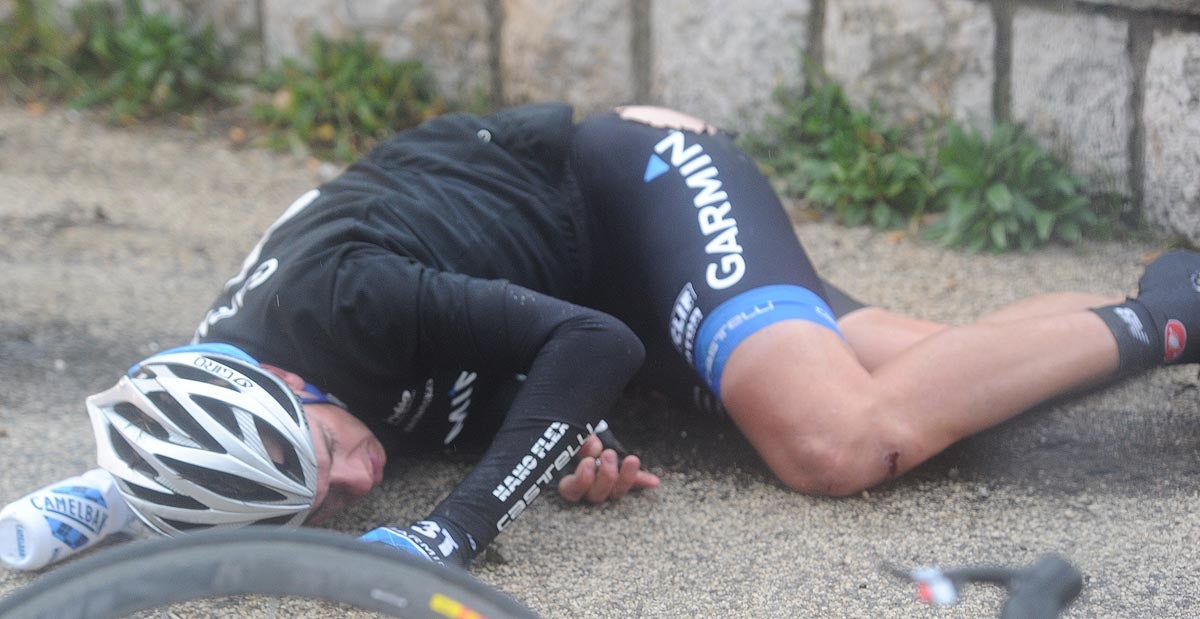 Scores of other riders hit the deck, including Tejay Van Garderen (HTC-Highroad) and Heinrich Haussler (Garmin-Cervélo) who both crashed late in the seven-climb stage. Haussler crashed “several times,” the team reported, including once into a cement wall, but he survived to bolster his lead in the points jersey.