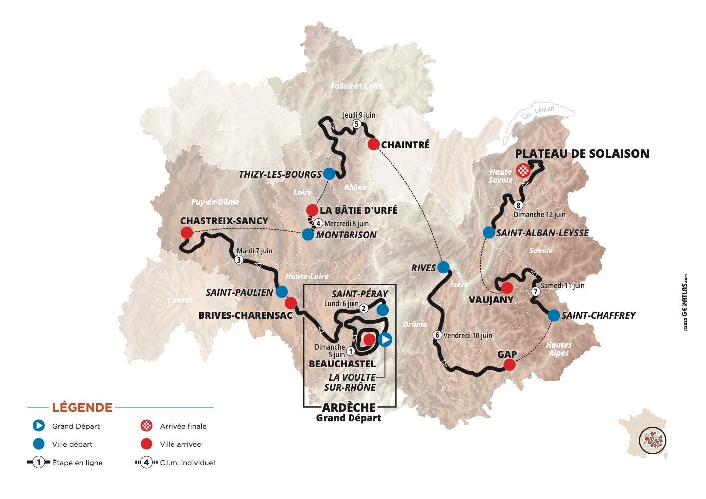 The eight-stage race, running from Sunday to June 12, hits a mix of terrain across central and eastern France, with stages into the Massif Central, some transition stages and an individual time trial, before climbing into the Rhône Alps for the final weekend.