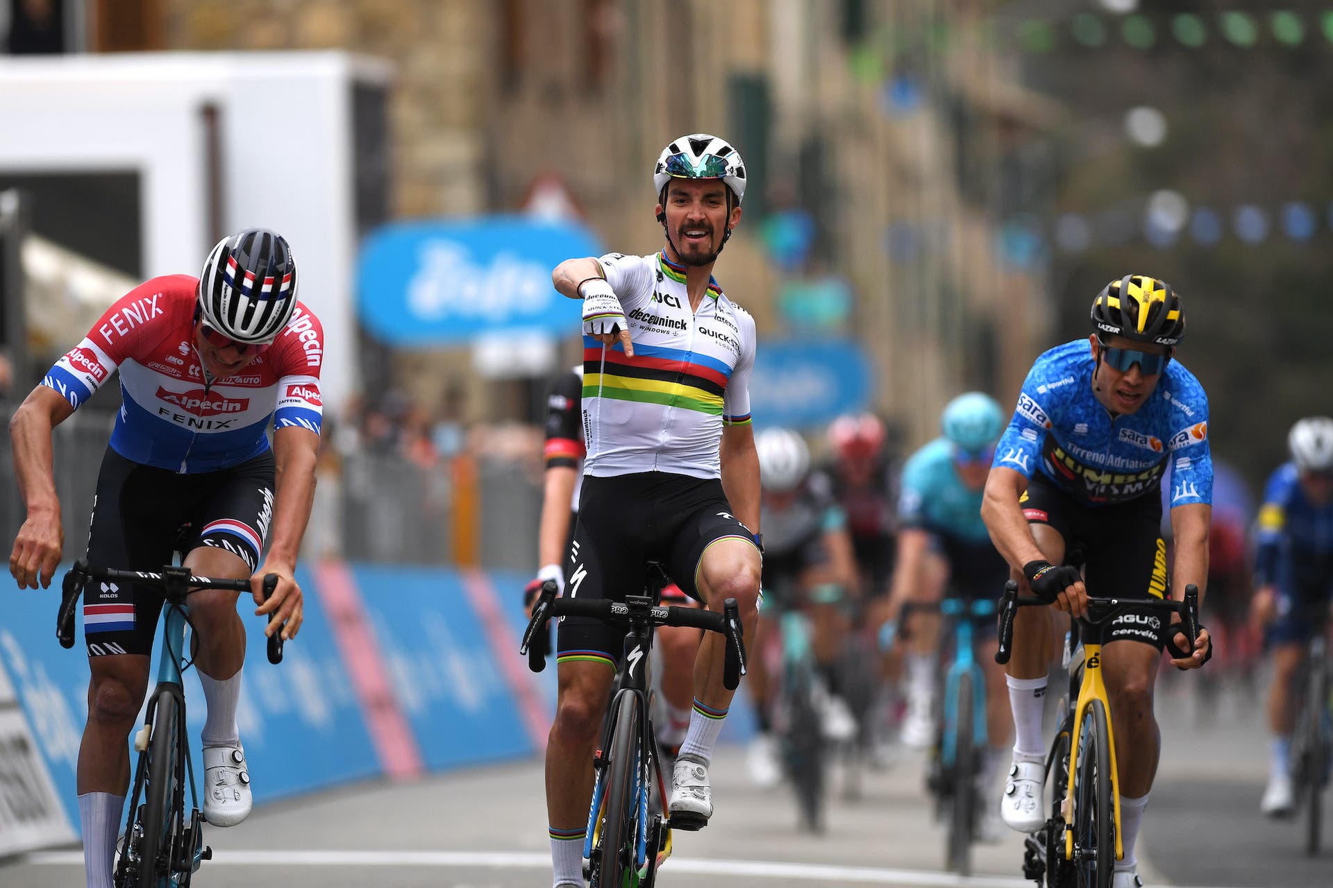 Peter Sagan was still on the road, pedaling out the closing kilometers of stage 2 of Tirreno-Adriatico when Julian Alaphilippe, Wout van Aert and Mathieu van der Poel were busy cracking champagne and posing for photographs together on the winners’ podium.