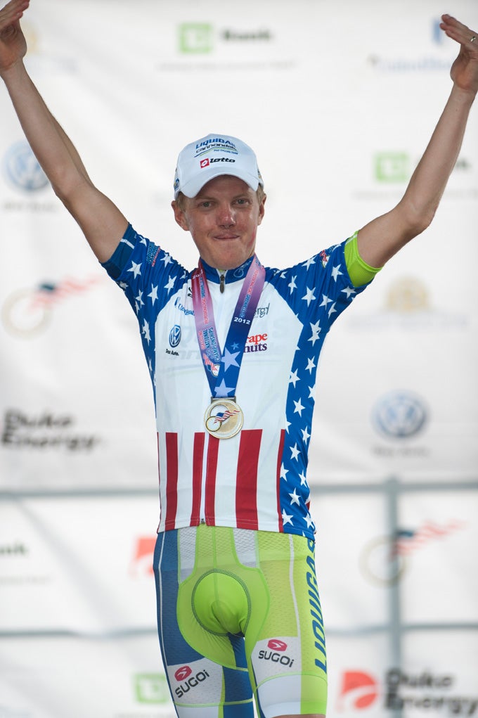 GREENVILLE, South Carolina (VN) — As Timmy Duggan took the top step of the podium at the USA Cycling Professional National Championship road race Monday, his Liquigas-Cannondale teammate Ted King stood to the side of the stage, fighting back tears. Not only have the two formed a close bond as the lone American members of the Italian ProTeam, their championship weekend in Greenville, South Carolina, was a real do-it-yourself affair.