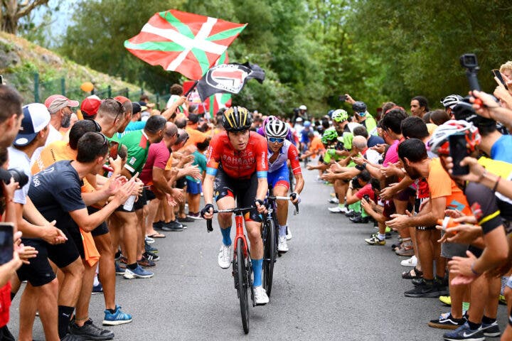 LES PRAERES-NAVA, SPAIN - AUGUST 28: Fred Wright of United Kingdom and Team Bahrain Victorious competes while fans cheer during the 77th Tour of Spain 2022, Stage 9 a 171,4km stage from Villaviciosa to Les Praeres. Nava 743m / #LaVuelta22 / #WorldTour / on August 28, 2022 in Les Praeres. Nava, Spain. (Photo by Tim de Waele/Getty Images)