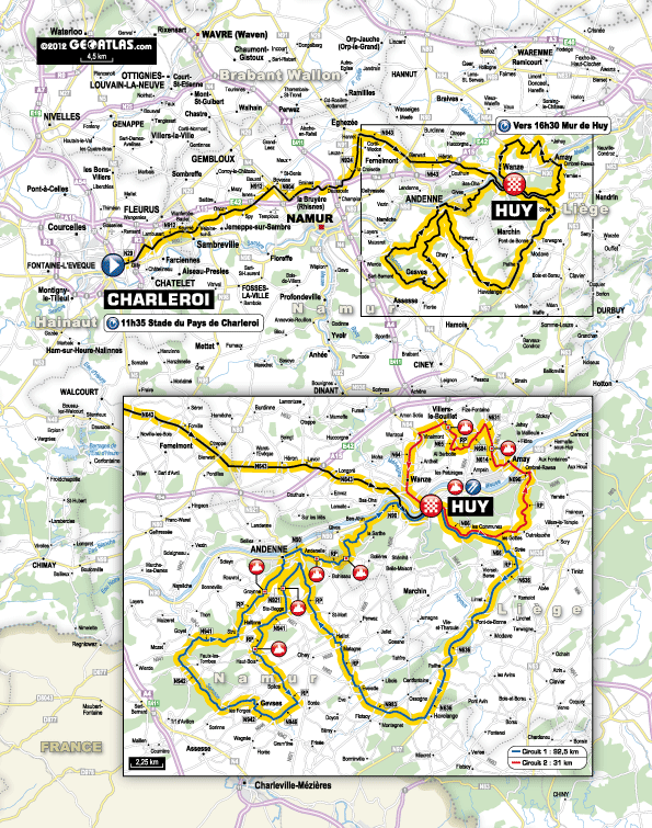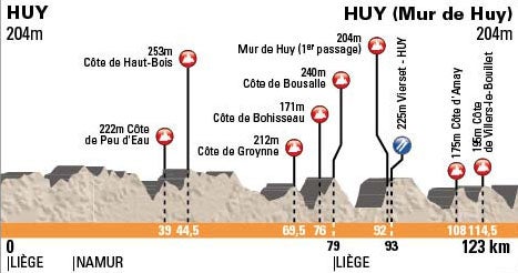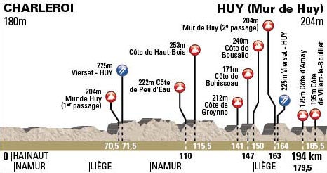The route starts in Charleroi, a gritty coal-mining town, and pushes west across wind-blown farms 70 kilometers into Huy for the first of three passages up the Mur. The course loops east over five rated climbs that usually see the first major selection on the race before heading through Huy for a second passage up the Mur.