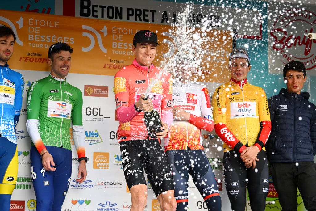 Neilson Powless celebrates his first pro GC victory Sunday in France at Etoile de Besseges. (Photo: Luc Claessen/Getty Images)