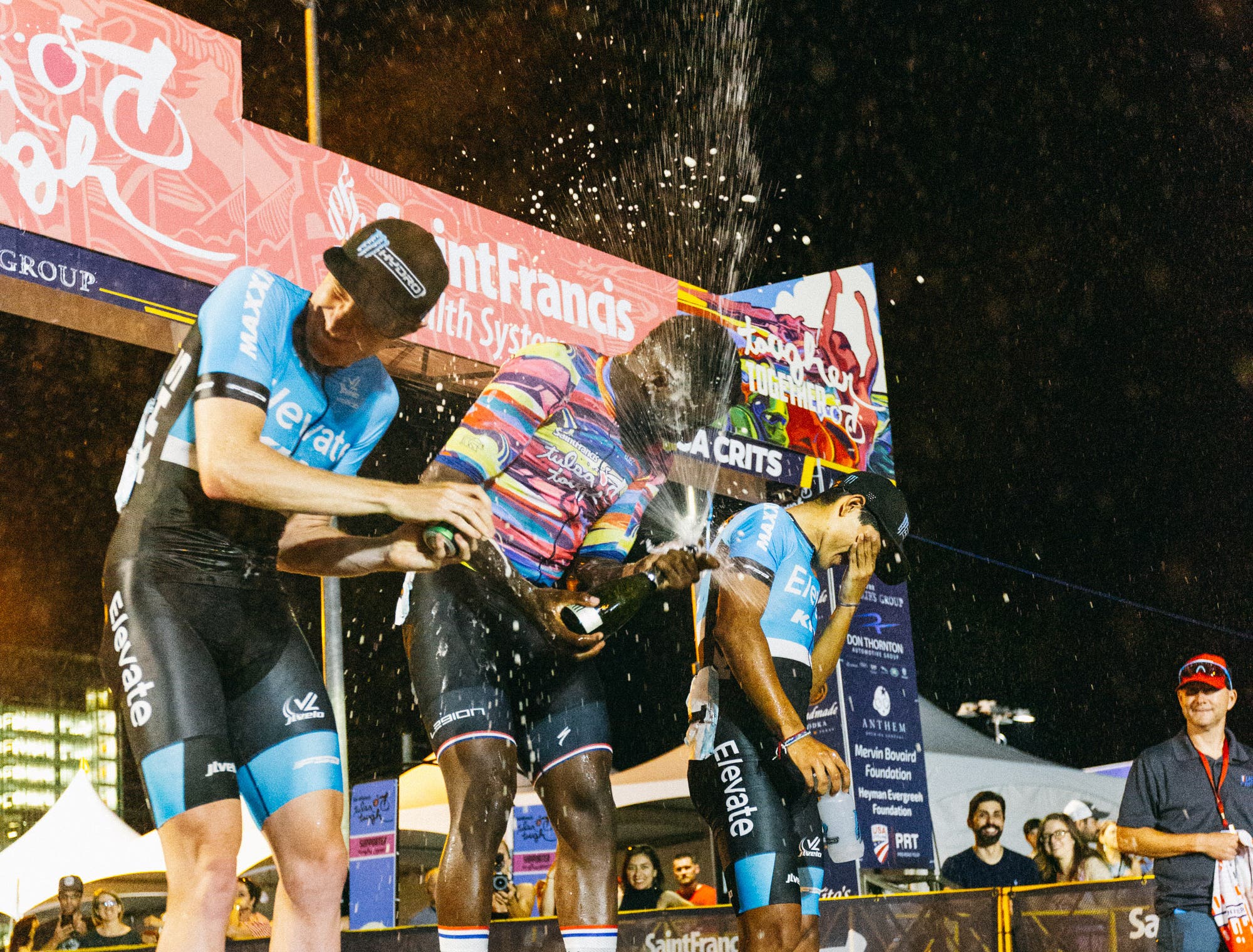 At some races, teams maintain the competitive vibes even off the bike. That’s not the case at Tulsa, where everyone comes together on the final night to celebrate. At the final party, rivals become friends