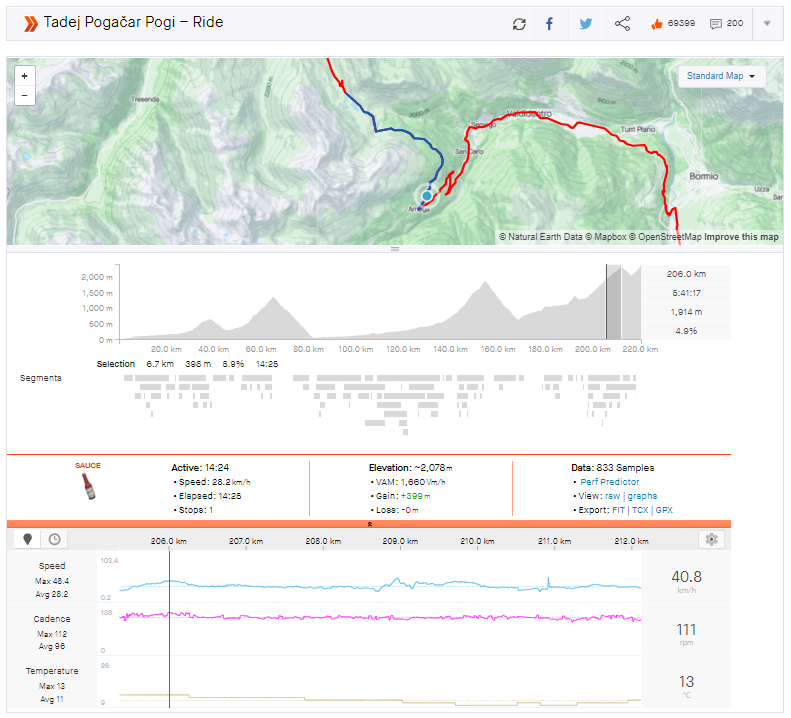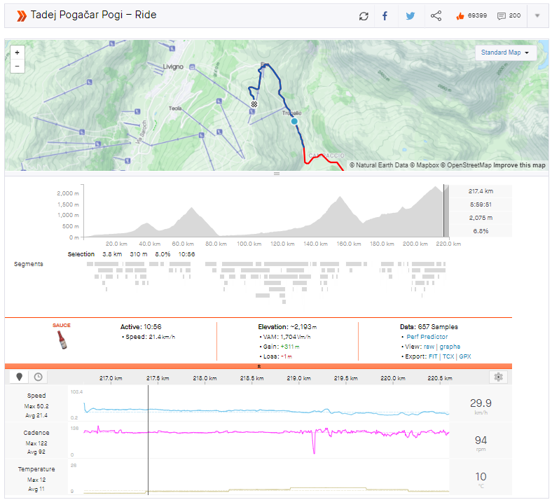 After a super-fast descent to the base of the Mottolino, Pogačar continued at his attacking pace to catch and pass the last survivor from the breakaway, Nairo Quintana. Pogačar continued to gain time on the final climb, and he won the stage in Livigno with a time of 6 hours 11 minutes and 43 seconds. Dani Martinez and Geraint Thomas were the best of the rest from the GC group, finishing two minutes and 50 seconds behind Pogačar.
