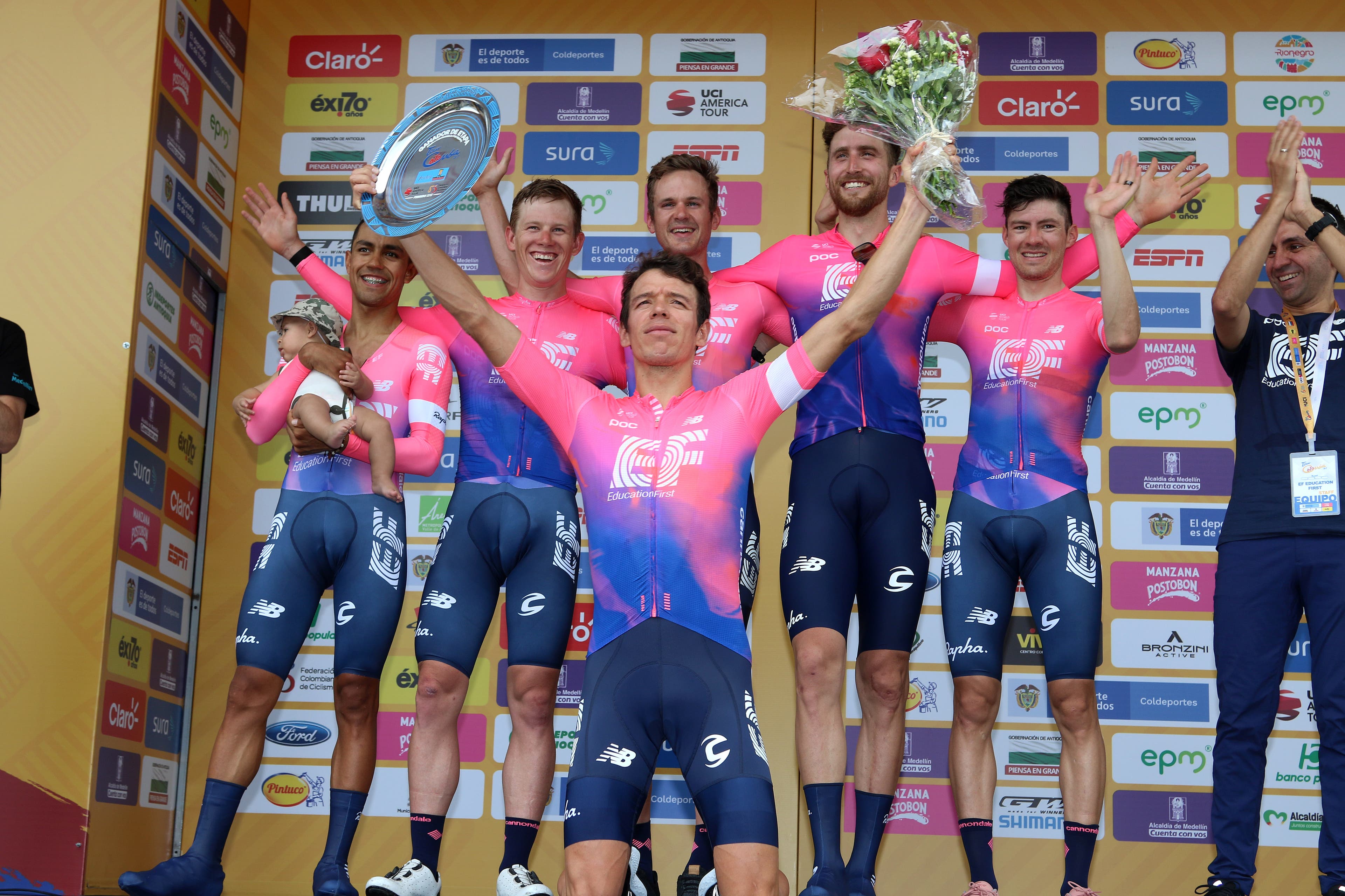 Rigoberto Urán Urán stood atop the stage in Medellín, having won the stage 1 team time trial with EF Education First at the Tour of Colombia 2.1. Celebrating the first orange leaders jersey of the week, Urán knelt down in front of the adoring crowd, put his head back and soaked in the scene. The crowd’s cheers were deafening—Urán’s countrymen bellowed with love and admiration.