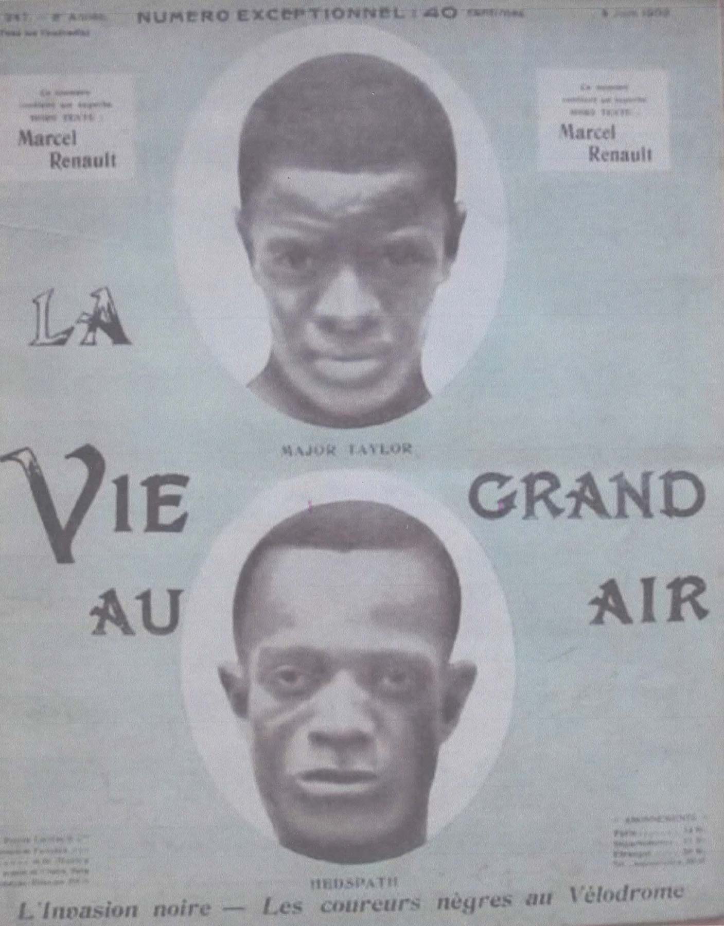 In the spring of 1903 in Paris, Hedspath and Taylor teamed up in track events that drew big paying crowds. The pair matched pedal strokes and tactics against French rivals in contests promoted as Noir contre Blanche (Black versus white) to the delight of the Paris press corps. Beau and other photographers lugged their tripods and boxy wooden cameras around to take their pictures. Paris sports magazines such as La Vie Au Grand Air splashed their faces across front pages prominently displayed on newsstands and kiosks to promote circulation — unlike American cycling publications that trafficked in minimal, begrudging, condescending coverage.