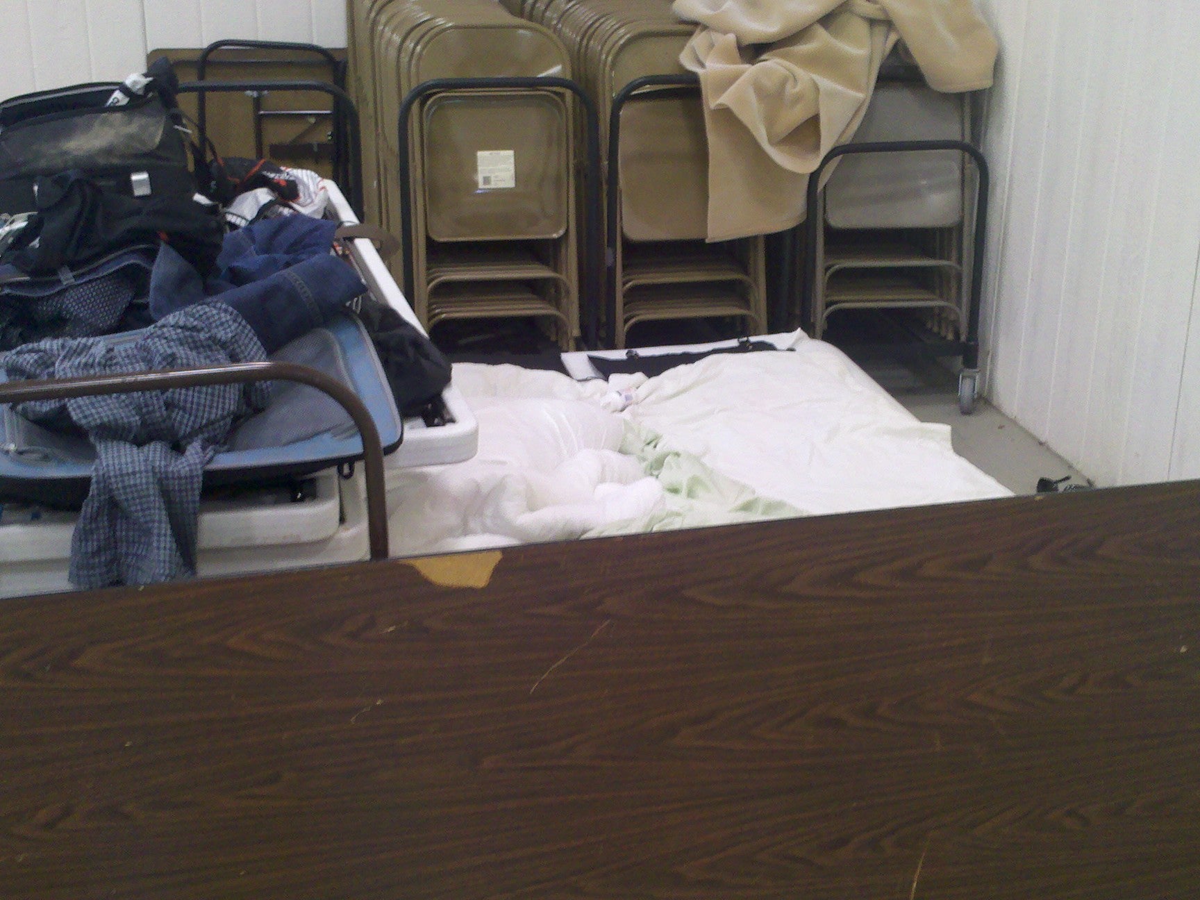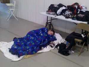 We’re staying at the same race-provided host housing we had last year. It’s an interesting setup, in the gym of the Indian Hills Baptist Church. Remember watching news stories of Katrina victims, staying on rows of air mattresses and cots in big, open rooms?