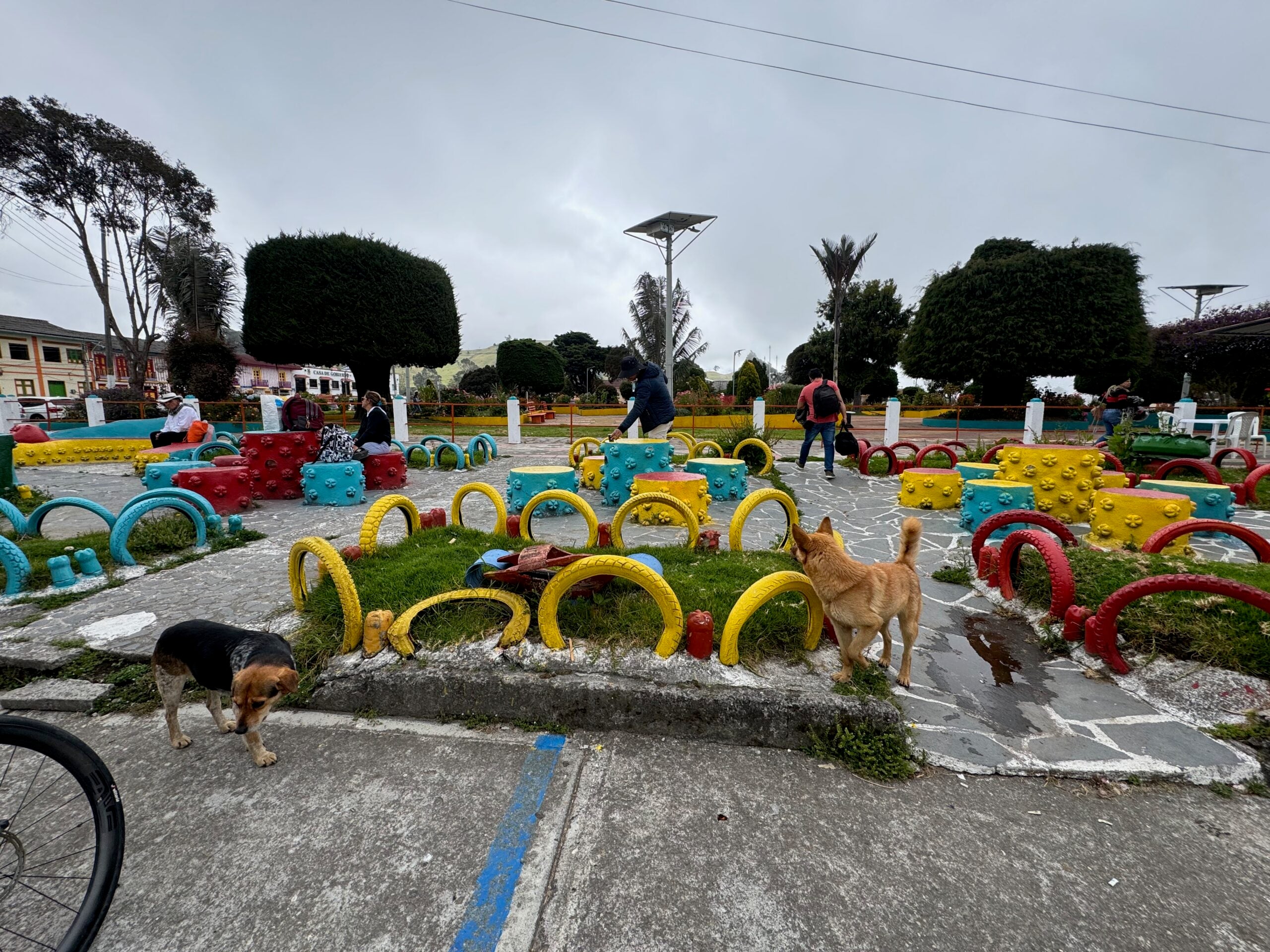 The town square is colorful, with bicycle and motorcycle tires repurposed as an eye-catching contrast to the landscape.