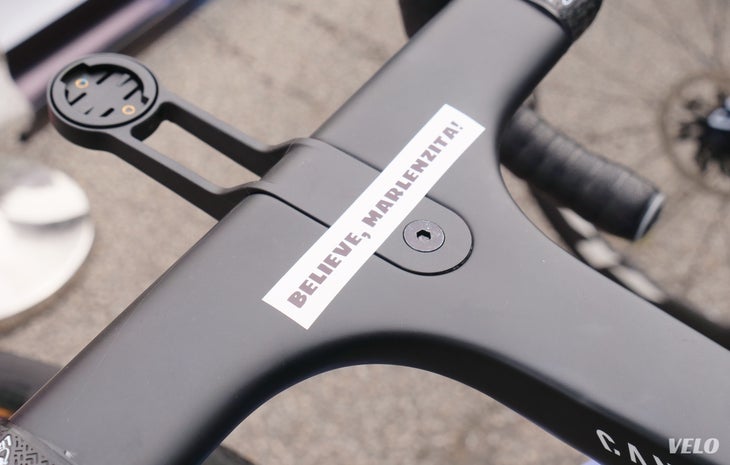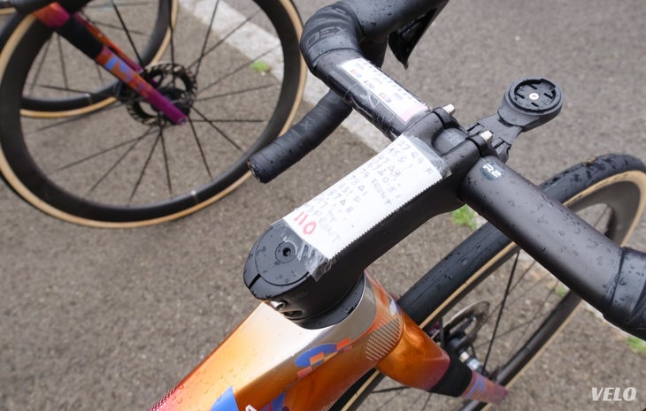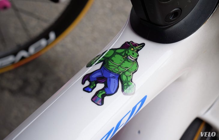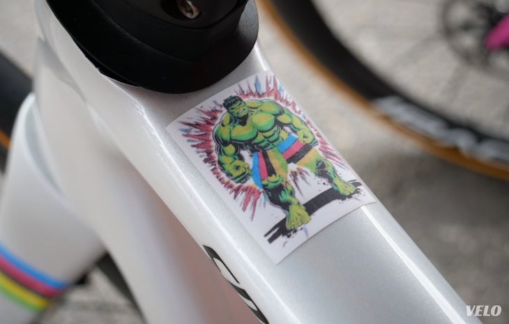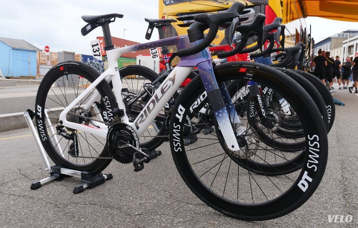 We’ve got a bike from Ridley that was built the night before stage 2 to celebrate the Belgian music festival Tomorrowland — yeah, an odd colab, but we’re here for it. Then there are the details, rider-specific wheels, the world champ Lotte Kopecky getting away with upsetting official sponsors by using a Syncros saddle instead of the Specialized ones that the rest of the team have to use. There’s even a drinks/coffee set-up that any pro team claiming marginal gains are key should be building into their team bus.