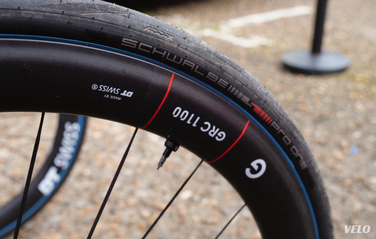 The real standout tech at Tudor, though, was their wheel setup: every rider was on the DT Swiss GRC 1100 gravel wheelset, paired with 32mm Schwalbe Pro One tubeless tyres. This isn’t the first time we’ve seen a team opt for the DT Swiss gravel wheels, as the 24 mm internal and 36.5 mm external rim widths match the wider tyre profiles much more seamlessly than DT Swiss’ road wheels.