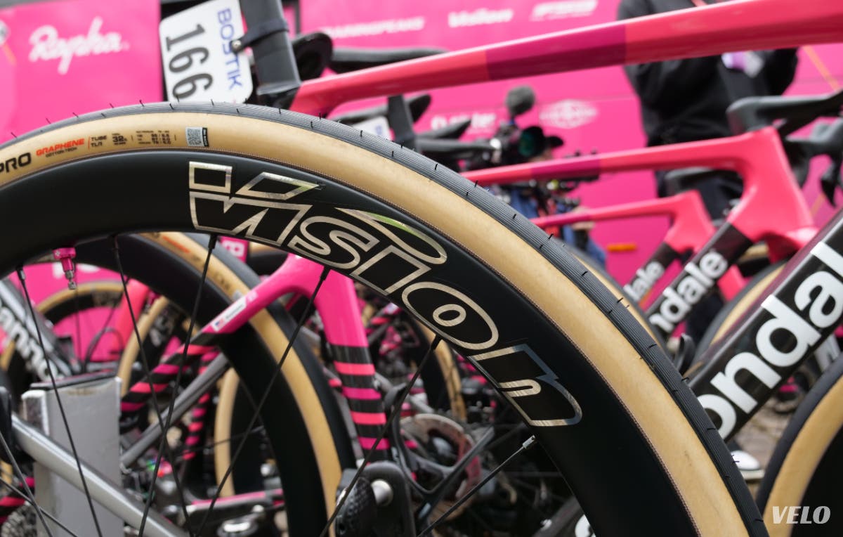 EF Education-EasyPost were one of the first teams using tubeless tyres at Roubaix a few years back, so there’s no change there; Vittoria Corsa Pros in 32mm throughout with inserts on Vision Metron SL 45 or 60 wheel sets. Every team, including EF Education-EasyPost, who are sponsored by Vision, were using the “older” SL version of the metro wheels rather than the recently released Metron RS version.