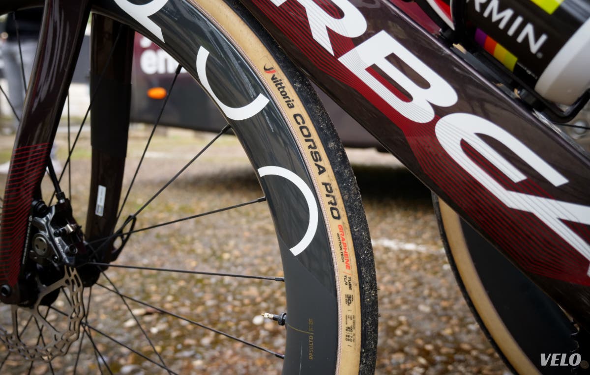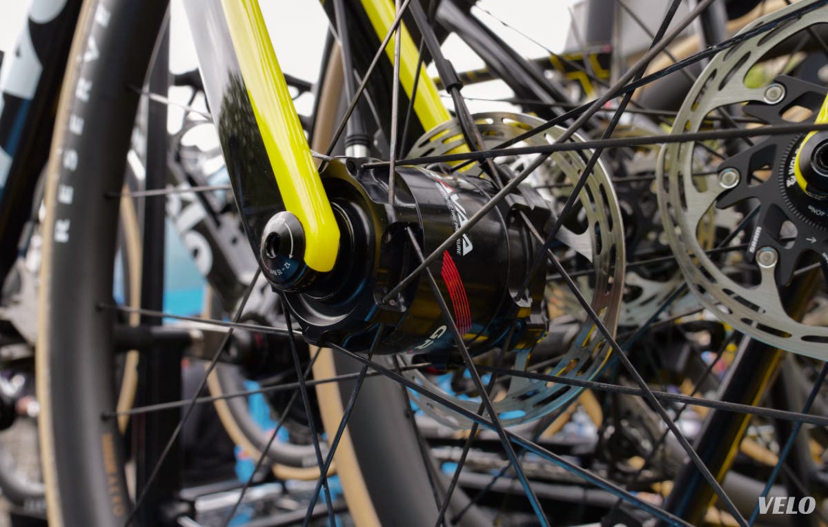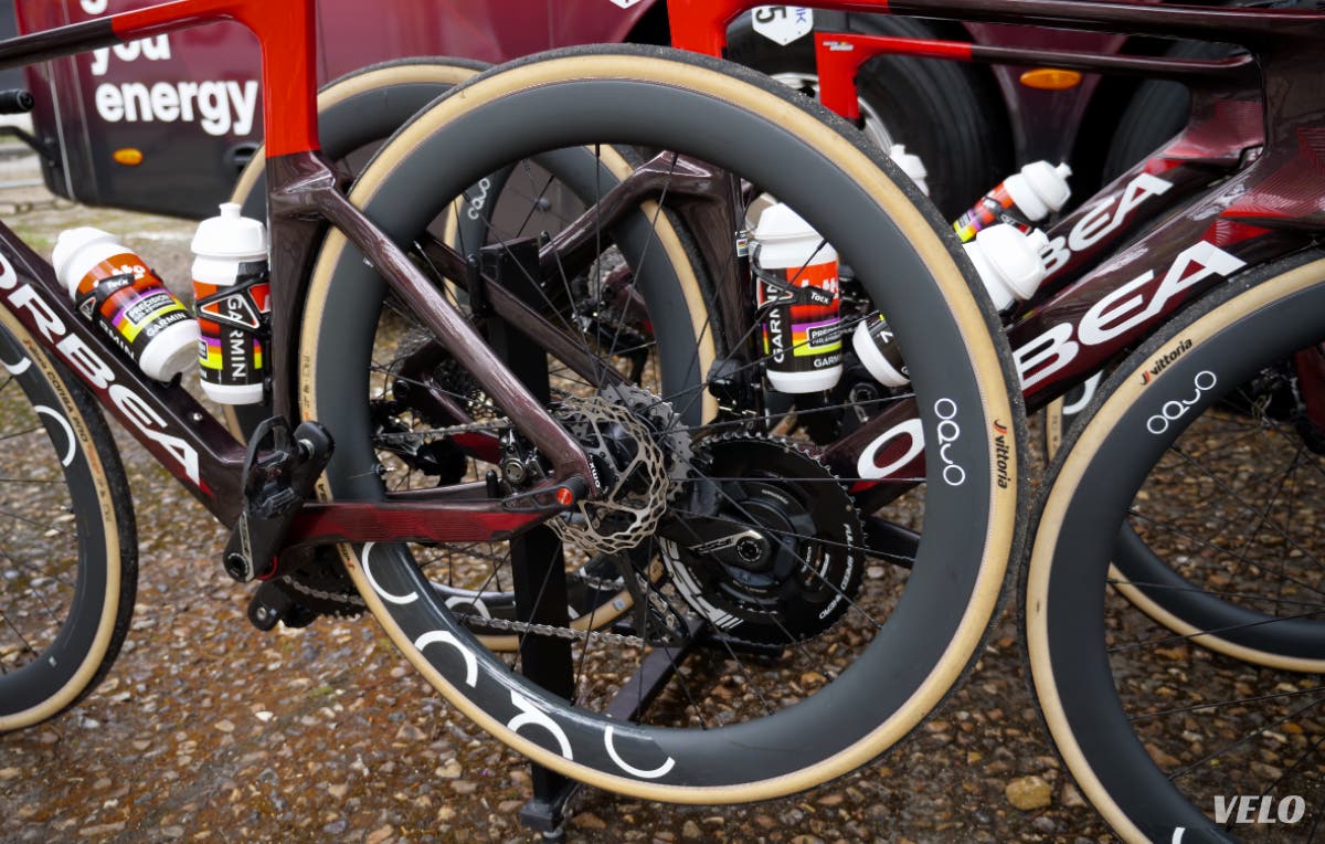 What was perhaps most noticeable were the new wheels from Oquo. These, I’m informed, are prototypes wheels with wide rims for gravel and road. They are 50 mm deep and wider than the current LTD 50 wheelset, with a seemingly ~25 mm internal rim. This may be the reason they seemed to be the only team I spotted using 30mm tyres; that extra inner rim width would allow the 30mm Vittoria Corsa Pros to blow up to be wider than their stated size.
