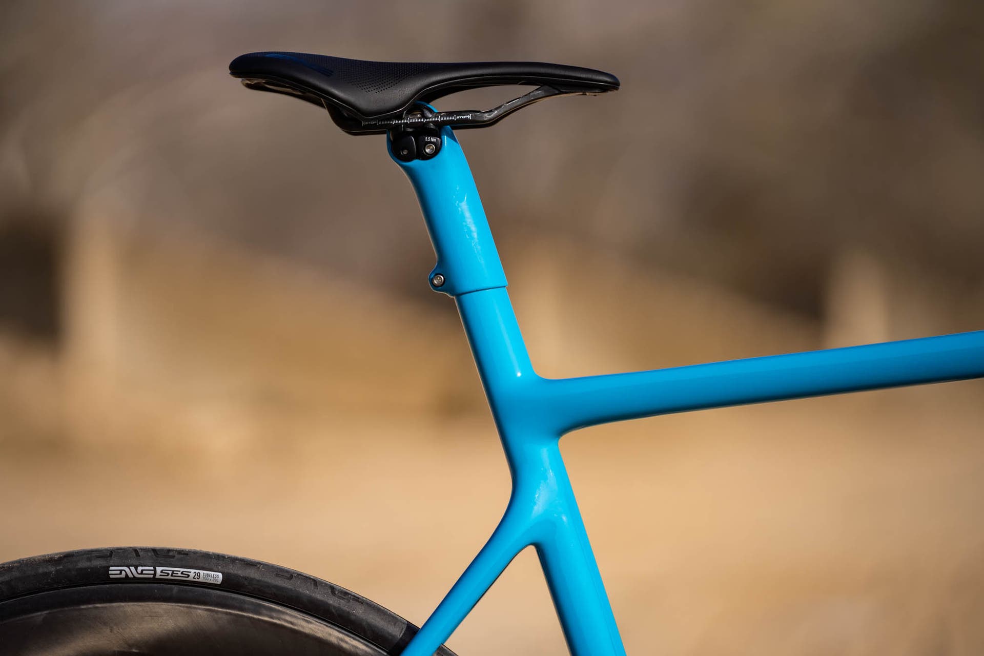 The bikes are built exclusively for electronic drivetrains. If buying a Shimano Di2 bike, the battery is tucked in the seatpost. The seatmast has about 40mm of height adjustment, to accommodate for the possibility of you changing saddles or cleats or position.